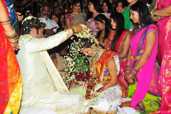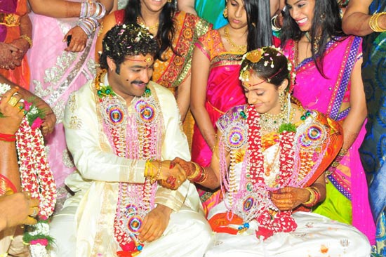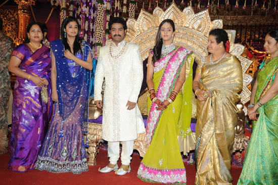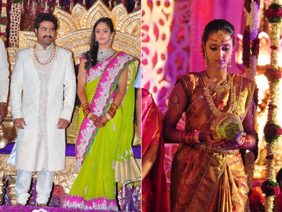 Pranathi wore traditional heavy silk sarees and gold jewellery for the wedding. For the reception, she chose a lime georgette saree with a pink border and white work teamed with heavy diamond jewellery. Junior NTR wore a white sherwani.