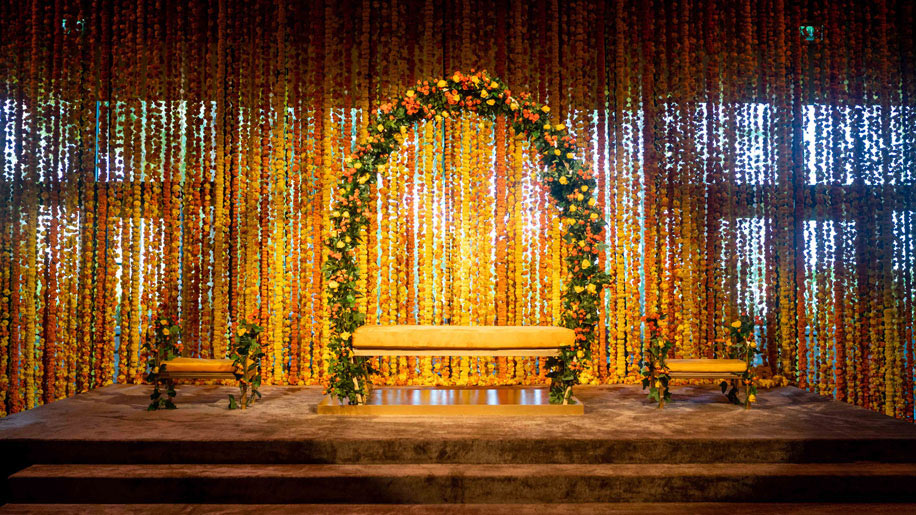 After checking into the Four Seasons Hotel Bahrain Bay (an architectural statement in itself) guests made their way to the haldi ceremony. The venue was smothered in yellow and orange marigolds and the planners set up the stage with a bridal seating in the same colors.