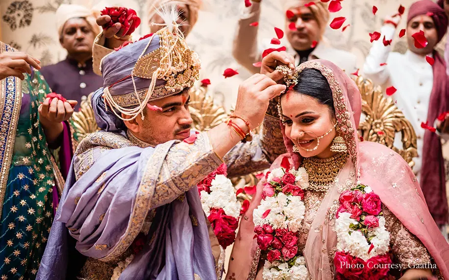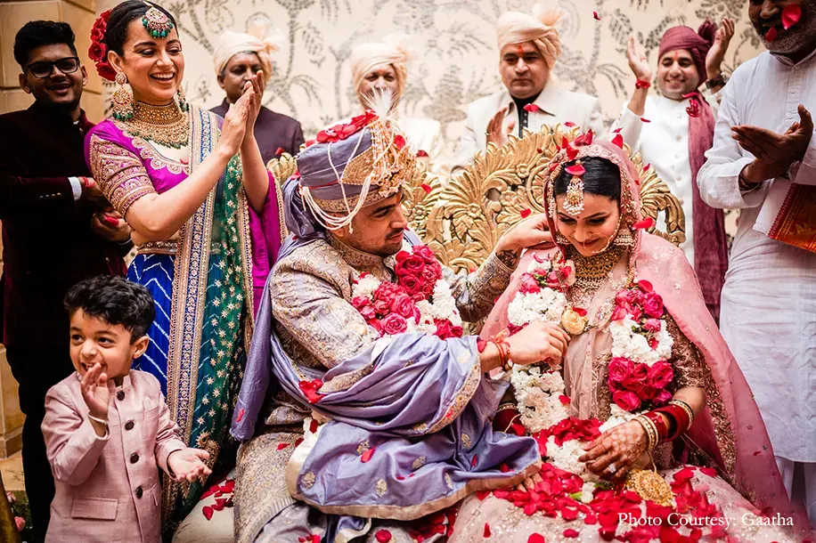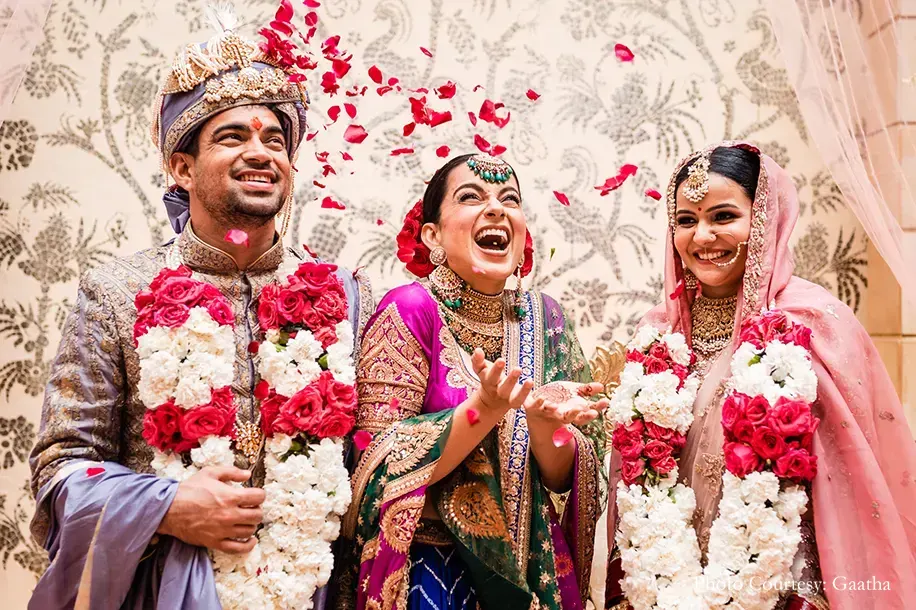 Actress Kanagana Ranaut’s brother Aksht Ranaut tied the knot with longtime girlfriend Ritu Sangwan, who is a doctor by profession, at Leela Palace, Udaipur. The actor chose an elaborate look for the occasion — a striking purple and blue lehenga by Anuradha Vakil that took 14 months to make. She accessorised her look with a statement neckpiece and a stunning maang tikka from Sabyasachi’s jewellery collection.
