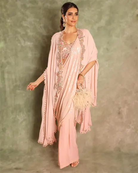 For her second inspirational look, Karishma was seen dressed up for a diwali party hosted by Bunty Sachdeva in a peach-pink sequined sari with an embroidered cape from Dolly J Studio and statement polki and emerald earrings from Uncuts – The Polki Story.