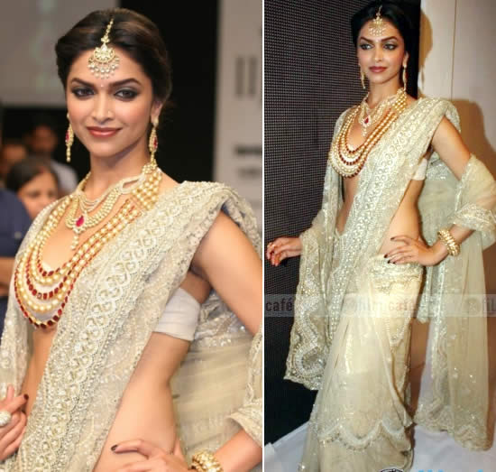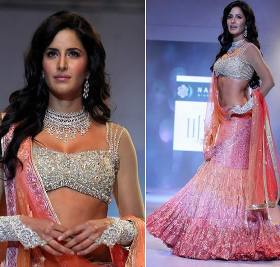 Bollywood brought the necessary glamour to The India International Jewellery Week with Katrina Kaif walking for Nakshatra diamonds in a lace lehenga by Neeta Lulla and Deepika Padukone for Farah Khan Ali in a beige Ana Singh Saree.