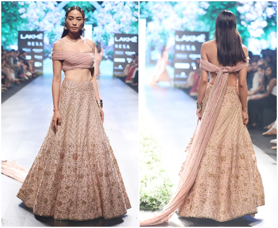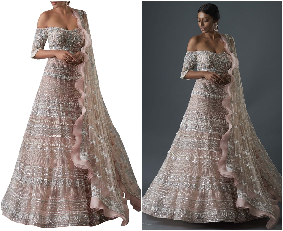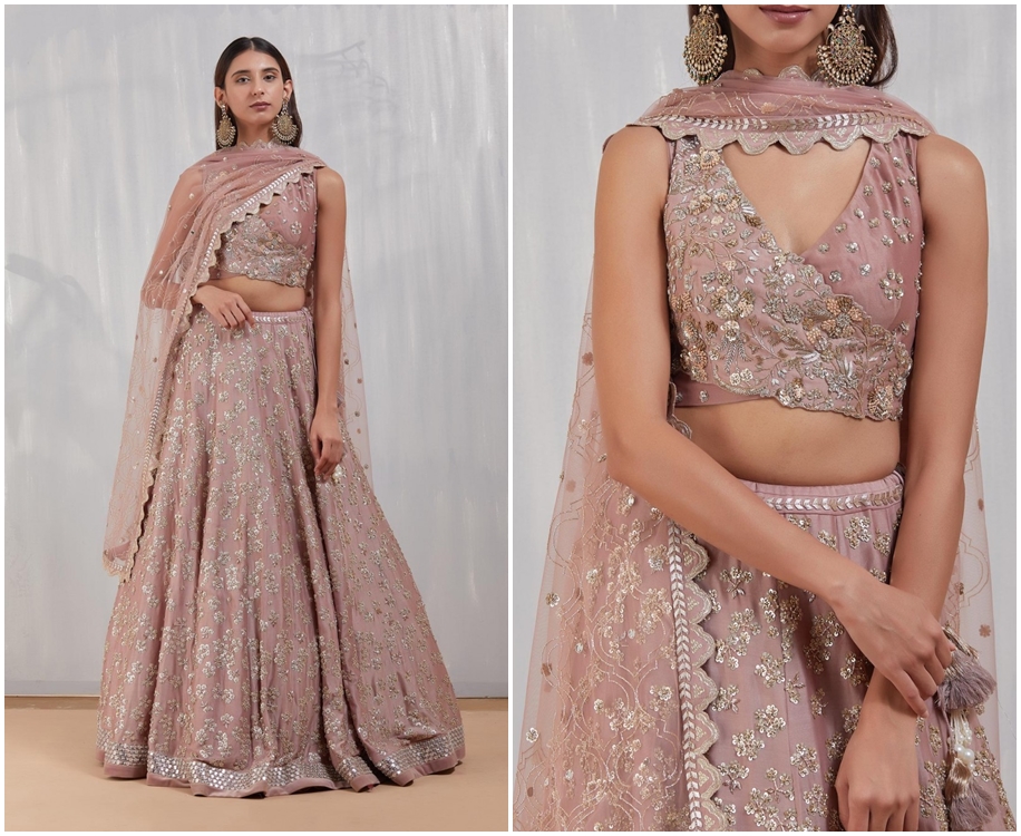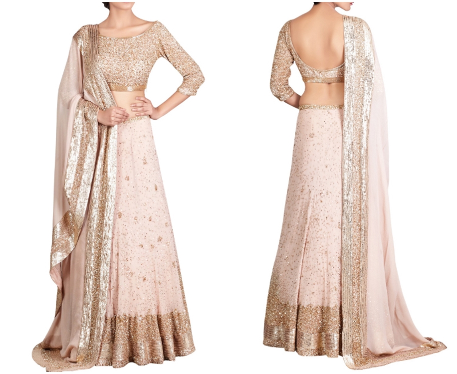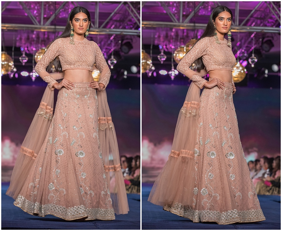 Rose Gold Chiffon Bead Embellished Lehenga Set by Nakul Sen
