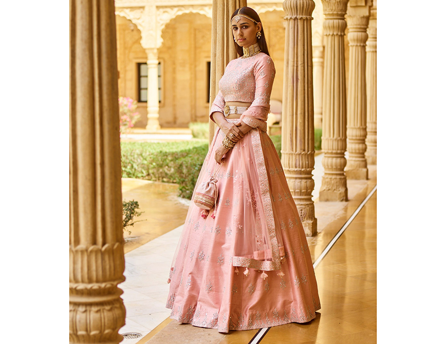 If you’re in the market looking for a lehenga to wear to a summer wedding, Kiara Advani just offered up an idea. She was photographed wearing a heavily-embellished bubblegum pink lehenga from Manish Malhotra‘s spring/summer 2020 collection for a family wedding in Jaipur with a long-sleeved blouse and sheer dupatta featuring delicate embroidery. She elevated the look with a pair of minimal diamond earrings by Manish Malhotra Jewellery and gold/ silver potli bag.
