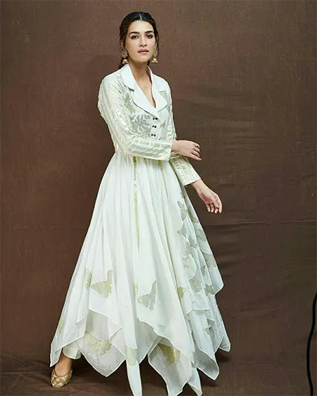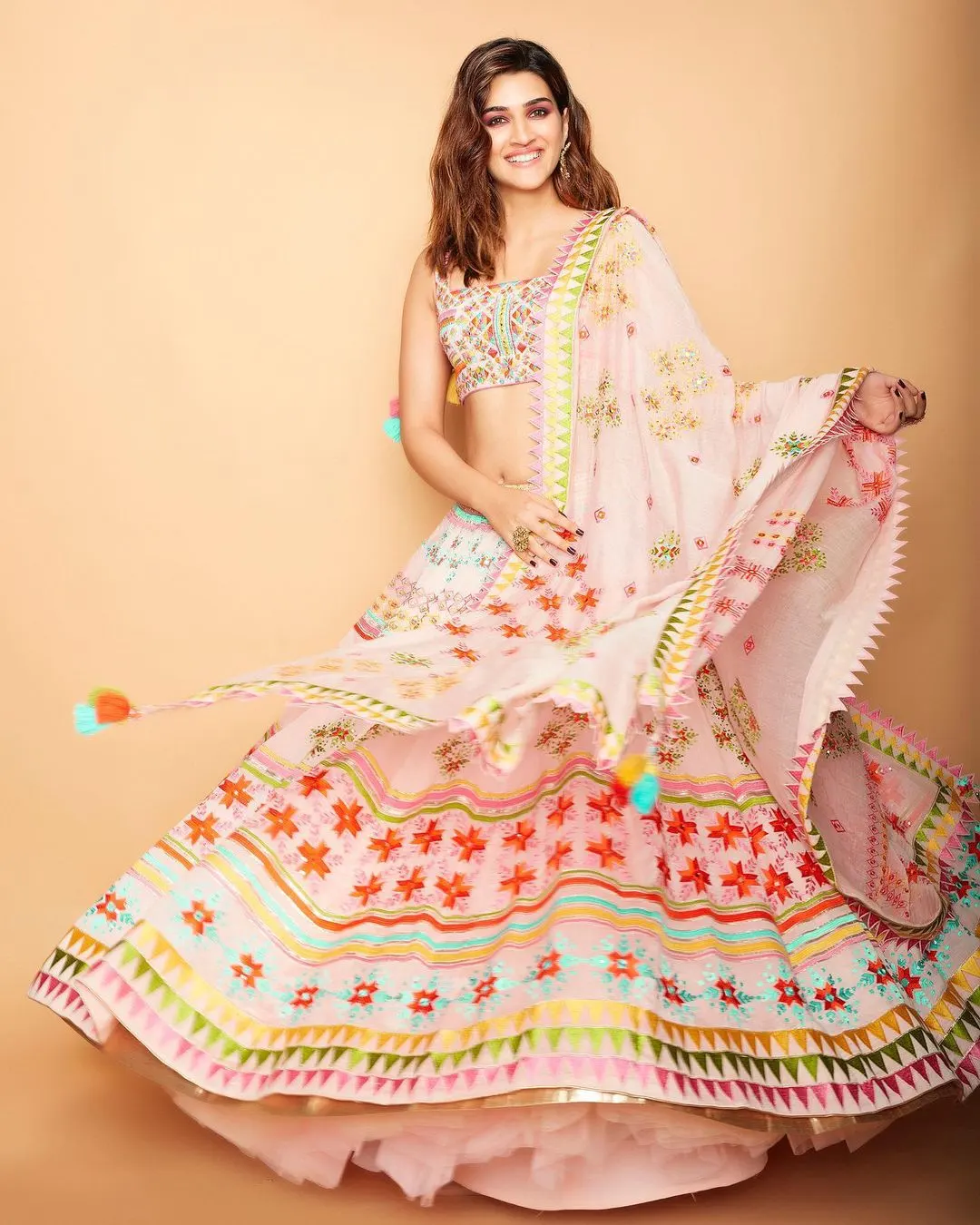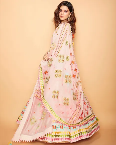 Here are Kriti’s festive looks – the first is a white ensemble by Saharanpur based designer Mohammed Mazhar and the second is a Neo Phulkari lehenga made with organic cotton by Sukriti and Aakriti.