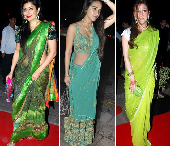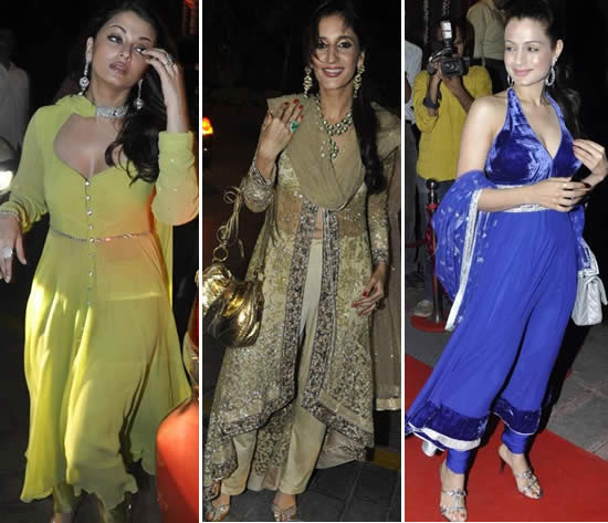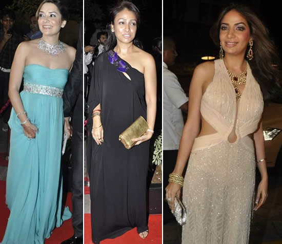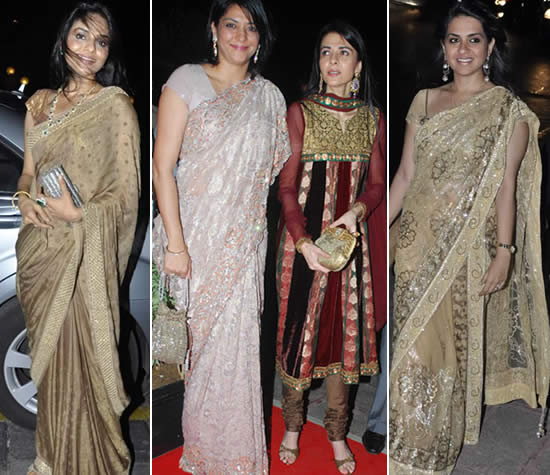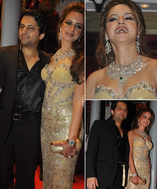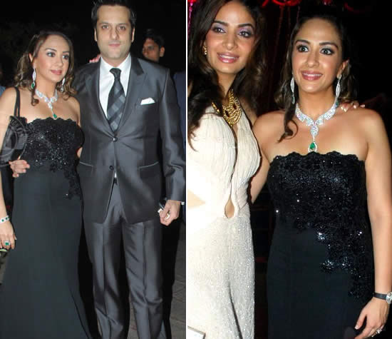 Laila Khan’s gold gown with lots of glitter was created by her designer mother Sundari Khan. She teamed it with a heavy diamond necklace by cousin sister Farah Khan. The groom’s clothes for all functions were created by Fardeen’s designer Shaahid Amir. For the reception, Shaahid designed for the groom a black suit and a black shirt in cashmere silk. Fardeen wore a grey silk suit with a white shirt and a grey silk tie.