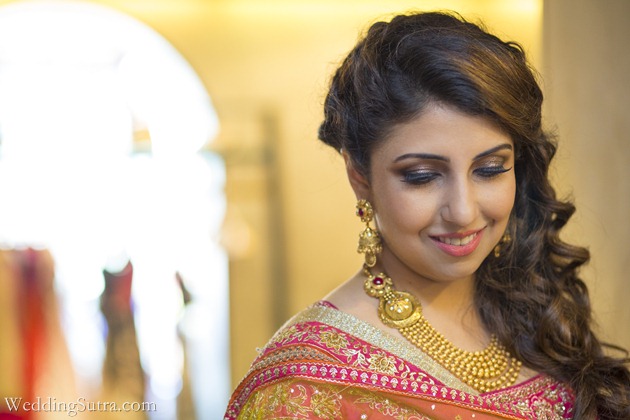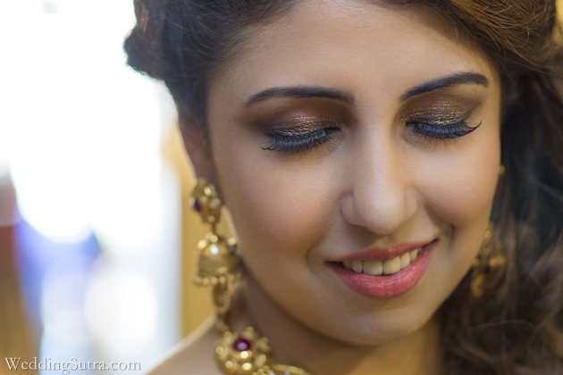 Pulling off the glitter eye trend can be a little tricky, so Makeup Artist Amrita Sanghavi demonstrates how to rock the glitter look with ease and confidence. She recommends glitter or metallic gels like Lakmé Absolute Gel Addict Eyeliner over powdered shadows. For bride-to be Faarah Sarkari at WeddingSutra On Location (link here), Amrita used the Lakmé Absolute Gel Addict Eyeliner in Metallic Bronze to create a shimmering effect. She then added a smokey effect with the Lakmé Absolute Kohl Ultimate on the upper and lower lash line and finished with a coat of Lakmé Absolute Flutter Secrets Dramatic Eyes Mascara to intensify the high-impact glitter look. While opting for glitter eyes, Amrita suggests keeping the rest of the face nude and let your eyes do the talking.
