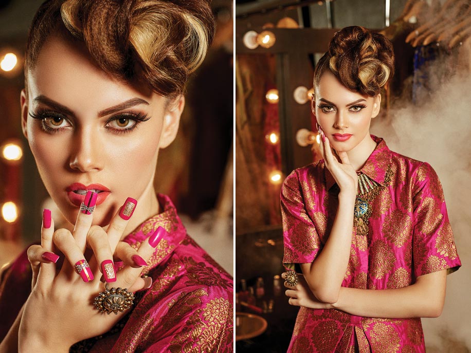 Bringing to life the flair of powerful women, this look blends magnetic shades of gold and black with subtle hues of pink. For eyes that command attention, a smooth gradient of copper-gold adds a smoky effect, while softly smudged kohl and bold lashes are styled to captivate. Complementary shades of orange and pink form a perfectly strobed base for dewy skin and lips, subtly enhancing this look
