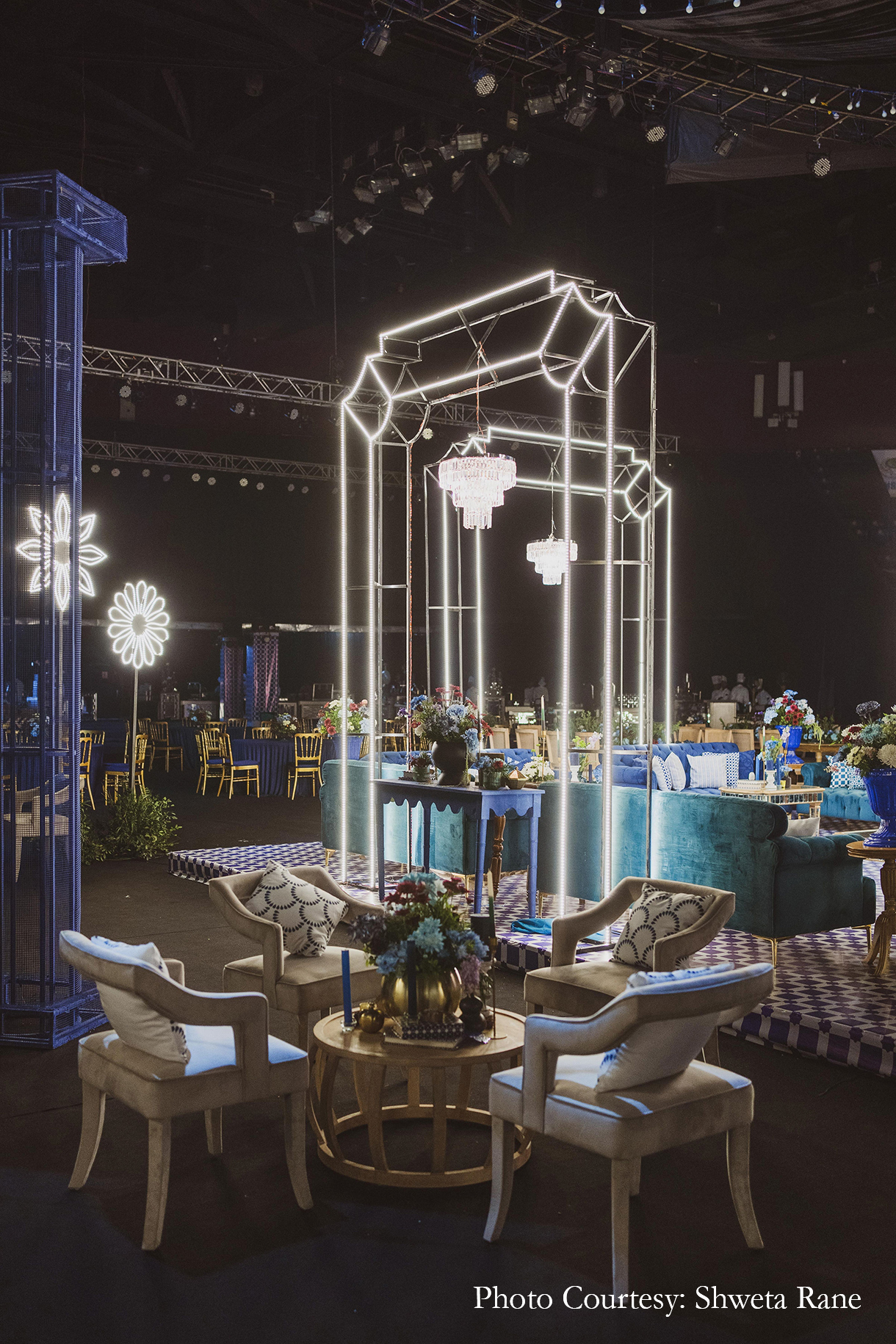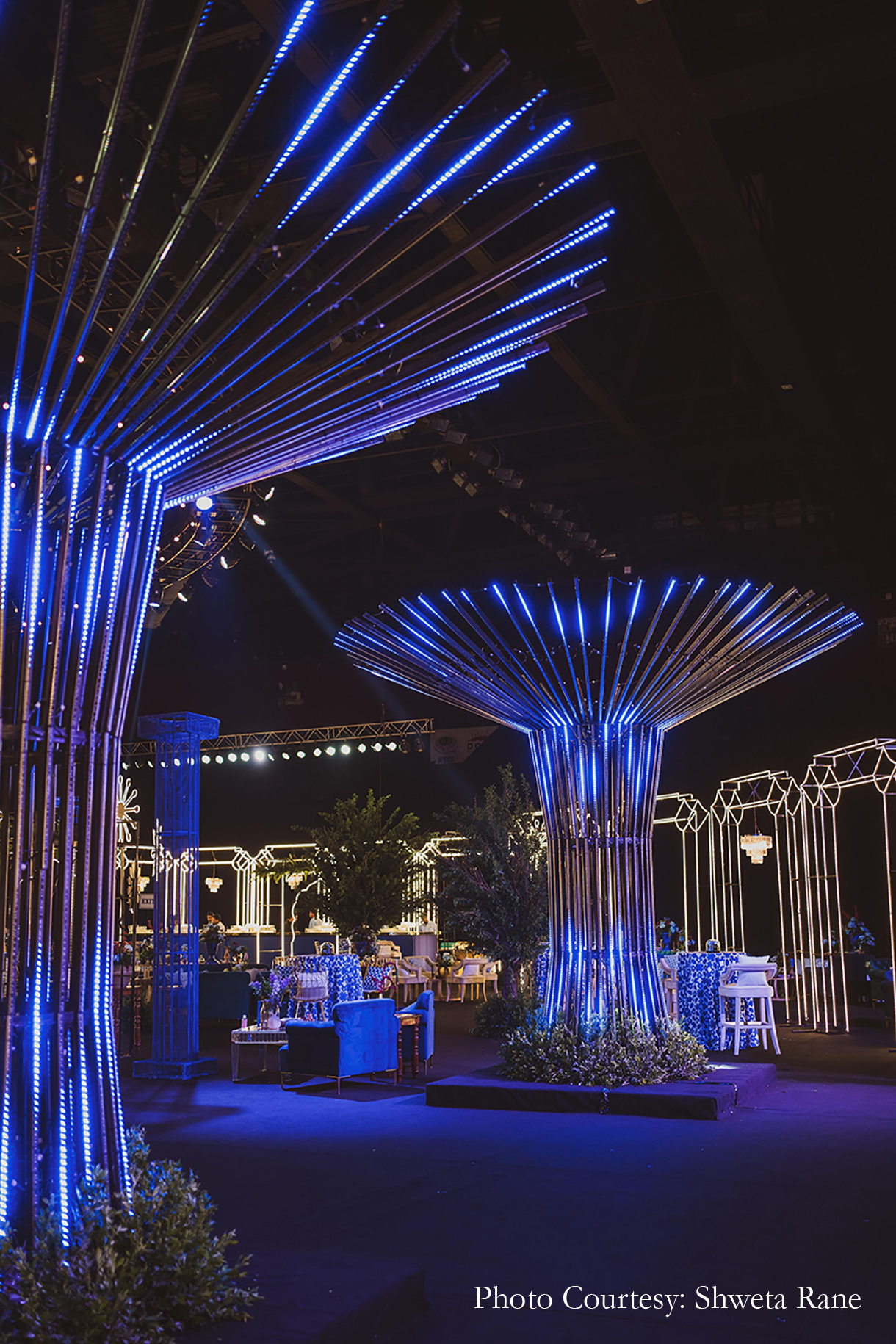 Aman Samani from Samani Decorators shares an overview of the concept and the reason why it was chosen, “The event was named ‘A Stellar Soiree’ and it was a fancy evening affair that transported guests into a dreamy world of a tunnel lit by a thousand fairy lights leading into the venue. The event was an escape into the retro world, where a perfectly lit stage added a dramatic look to the performances. Overall, the event promised to be a magical and memorable experience for all the attendees.