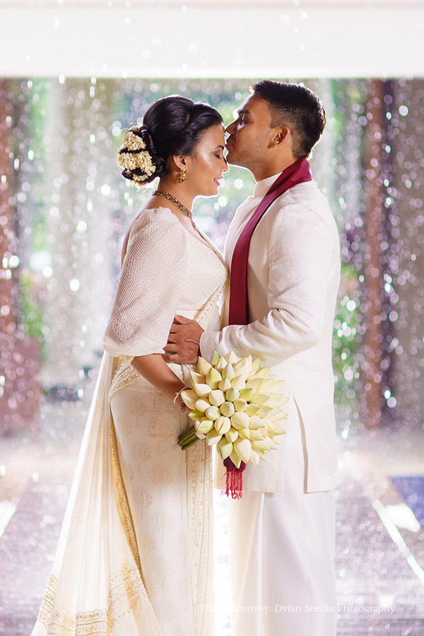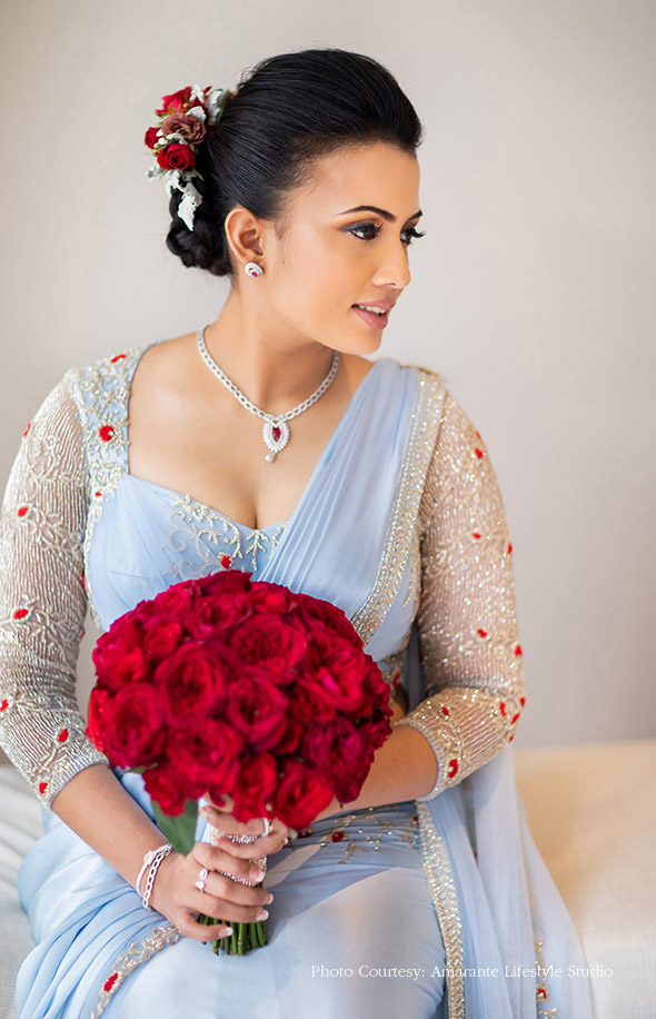 The couple perfectly color-coordinated their outfits. Limini wore a beautiful bluish-grey satin and net saree with red roses sequinned motifs, while Namal picked a darker grey coat and trouser set which he paired with a red, satin scarf. The bridesmaids and groomsmen followed the same color scheme. For their reception, Limini chose a white saree with a sequinned blouse that matched the groom’s plain white mundu and jacket set.