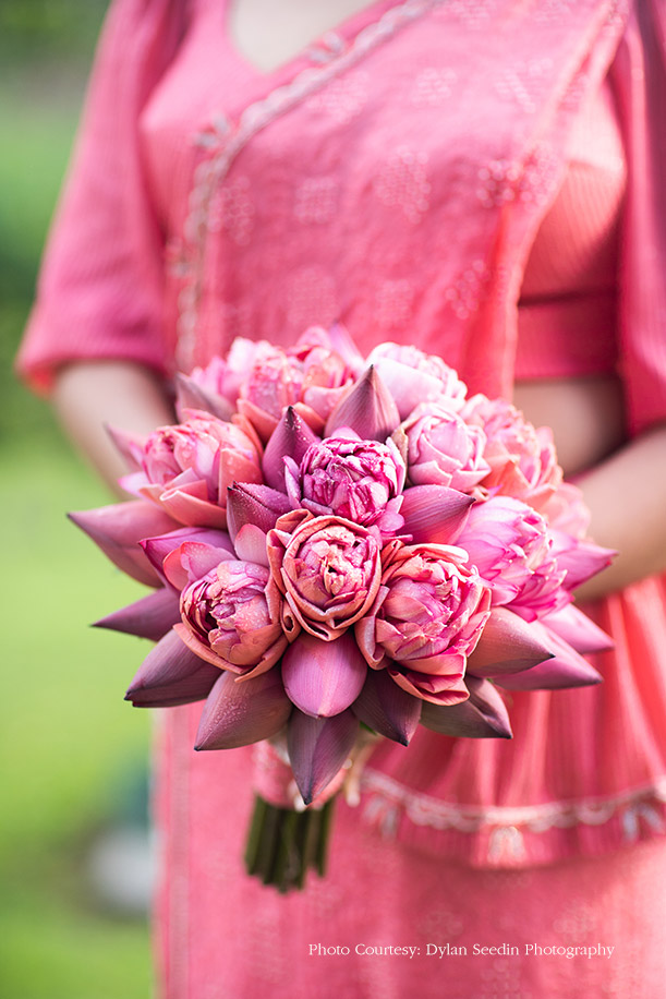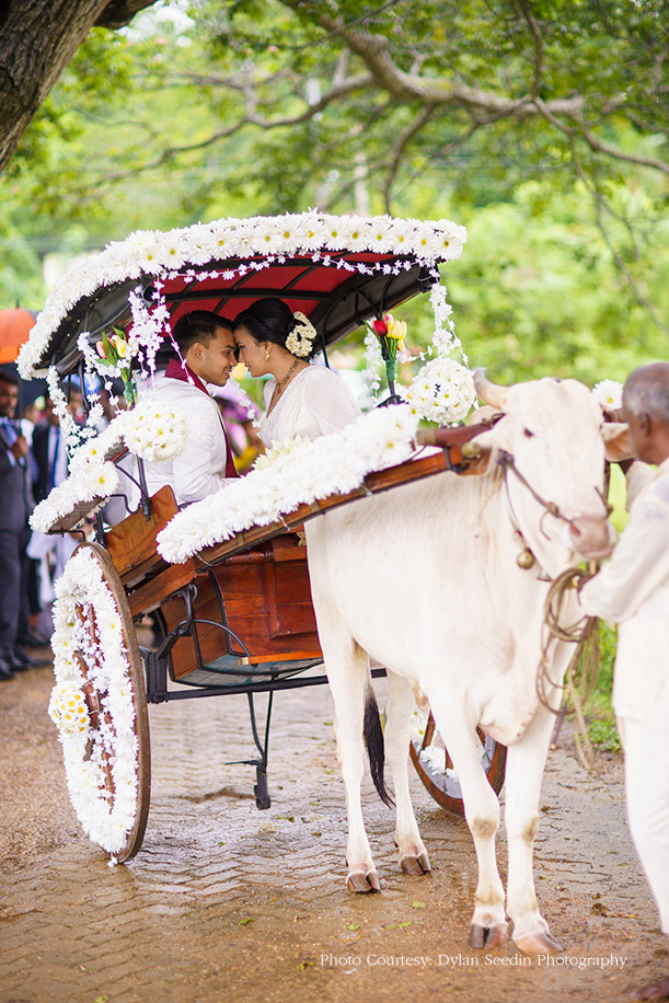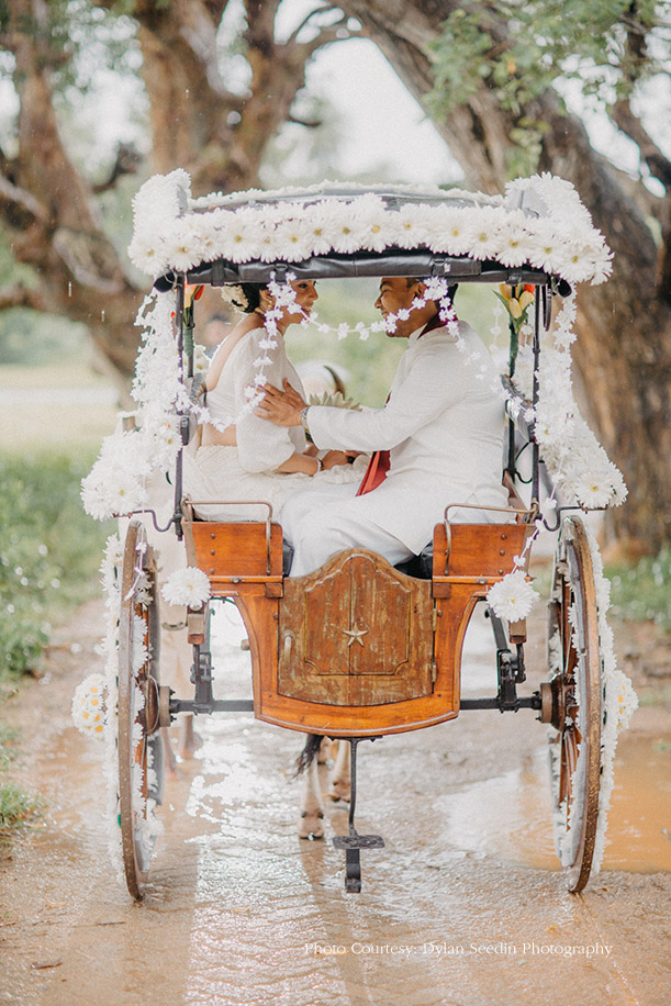 They took their wedding vows at the beautiful, Gangarama Temple where their close friends and family were present to witness the wedding. That was followed by a lavish reception at Mount Lavinia Hotel in Colombo, which is a stunning heritage property, for extended family, friends, and dignitaries from around the world. The wedding party rode into the venue in vintage cars.