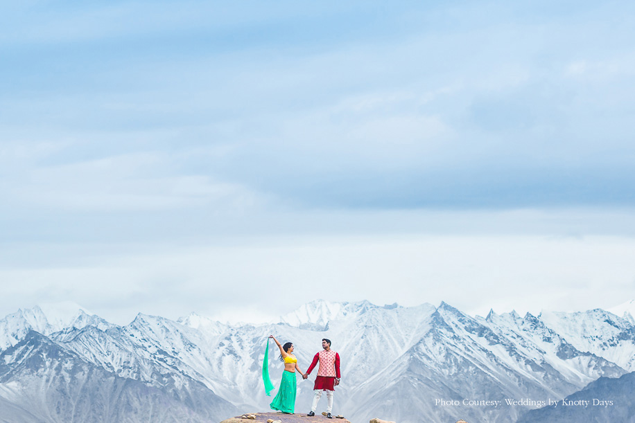 Love takes you higher and you have to be brave. Between two awe-inspiring mountain ranges, Karakoram and the Himalayas, the high altitude moonscapes of Leh-Ladakh are jaw dropping. The fact that Vishrut and Niharika braved thin oxygen levels and biting cold to get their gorgeous images, tells you a lot about what these two are willing to do for each other. The shoot by Weddings by Knotty Days is of an epic romance.