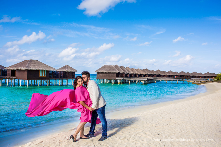 The natural beauty and tranquility of the sun and sea is distilled to perfection in the Maldives. Himanshu and Pronika look like their relationship is a carefree escape from the real world in their joyous, playful pre-wedding photo shoot on the beach by Weddings by Knotty Days.