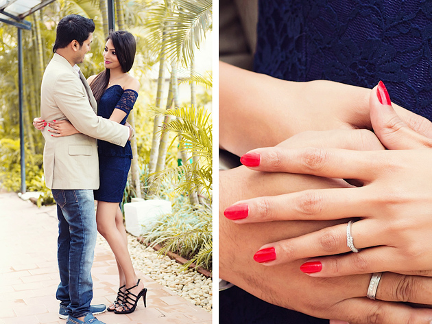 The duo decided to celebrate their love with Platinum Love Bands. “Before our formal engagement we started our search for Platinum Love Bands. We describe our style as simple and elegant, much like what Platinum is; and it is a magnificent metal that is known to last forever, so it perfectly symbolizes our love.” They found their rings at Bangalore’s C. Krishnaiah Chetty (CKC) & Sons. “We knew CKC has a reputation for selling the best quality diamonds, so when we reached the store they showed us some really nice platinum and diamond rings, and in a few minutes we chose our symbols of love.”