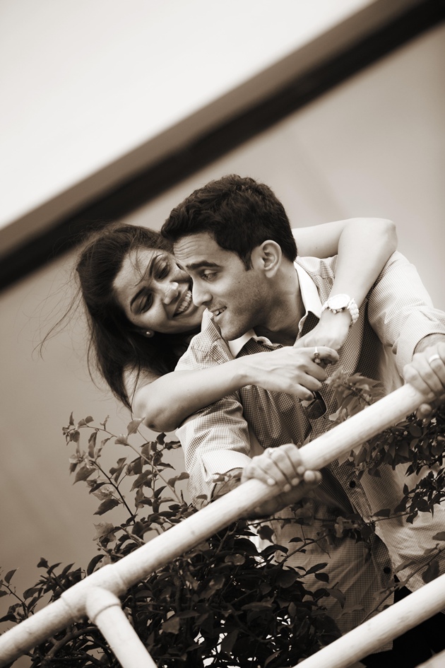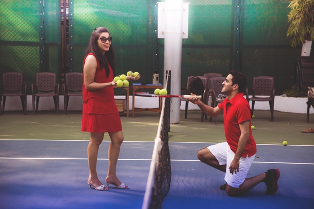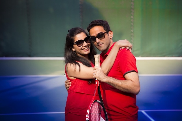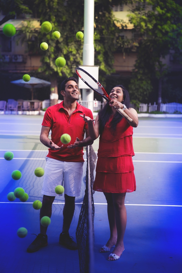 Shraddha and Ashok wanted their love for tennis to be captured eternally in frames. Their photographer friend Parag Gopale did a very interesting ‘game, set, match’ and ‘platinum rings’ shoot on the tennis court. “This was a very interesting experience on the courts”, says Parag, “after all the clean background and bright green tennis balls, add an amazing color touch.” True, its a great idea for all couples who share a love for tennis. And for those couples who aren’t tennis players, look for inspiration from another love the two of you share, whether it be a sport, movie, location or even color.