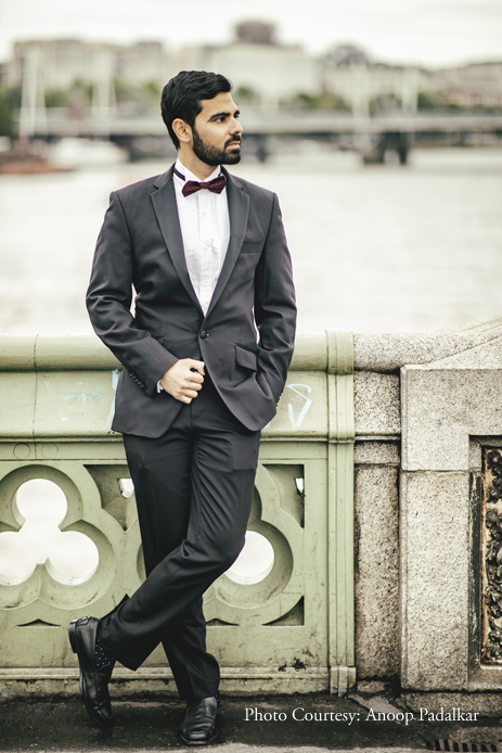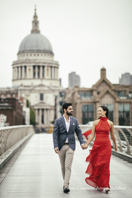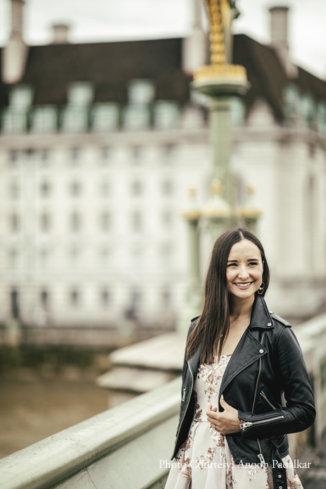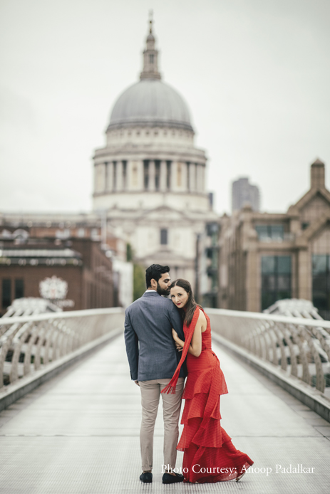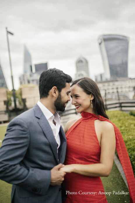 To maintain a distinct contrast with their wedding photographs which would all feature Indian outfits, the couple went with elegant Western ensembles. Danielle explained, “You can’t see from the shots, but there were lots of people around. It was a challenge to take good pictures with so many distractions, but Anoop deftly got great shots. Most of the shots were taken in the ‘City’ area of London, which is where we met and fell in love. It was special to revisit this area, anticipating our wedding, and have photographs to look back on forever.”