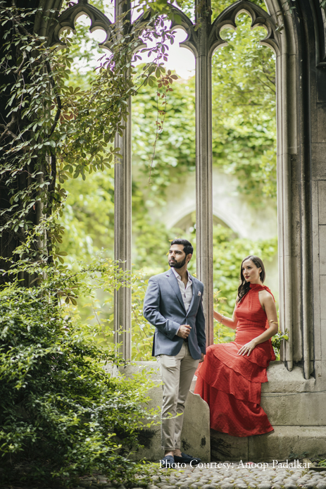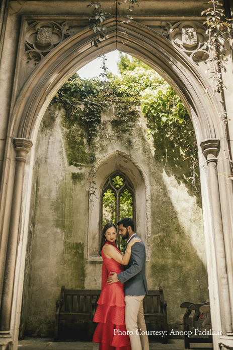 Danielle shared, “Because our wedding was in India, we wanted to do the pre-wedding shoot in our home city of London. A few weeks before the shoot, Nikhil and I went scouting for potential venues. After combing through popular choices like St Paul’s Cathedral, we found a wonderful little spot called St. Dunstan in the East. Largely destroyed during the Second World War, the overgrown rugged greenery of the church has transformed into a haven in the midst of tall, contemporary buildings. Ethereal and romantic, it was perfect as a background.”