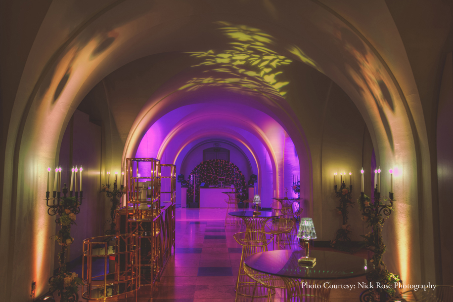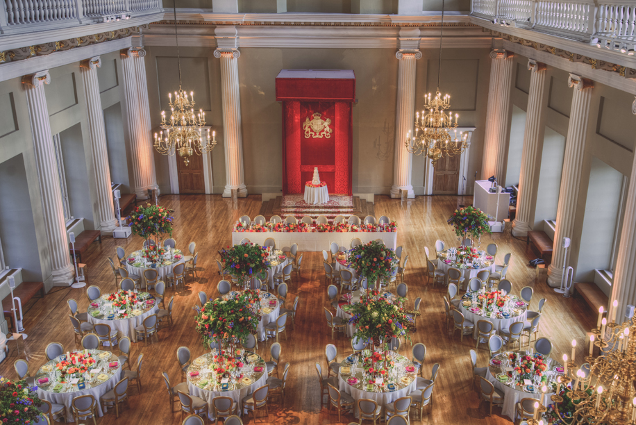After the ceremony, we led our guests upstairs to the Main Hall where the royal footmen opened the doors to our guests, welcoming them into a celebration marked by magnificence. This was the perfect backdrop to incorporate majestic Indian elements offset by pops of color. The drinks reception resembled the luxurious palaces of Rajasthan with gilded poseur tables and bar stools teamed with bright cushions and stunning jewel toned flowers. We chose not to have a first dance, however, we were surprised when my siblings and cousins performed a flash mob which kickstarted the dancing for the night!
