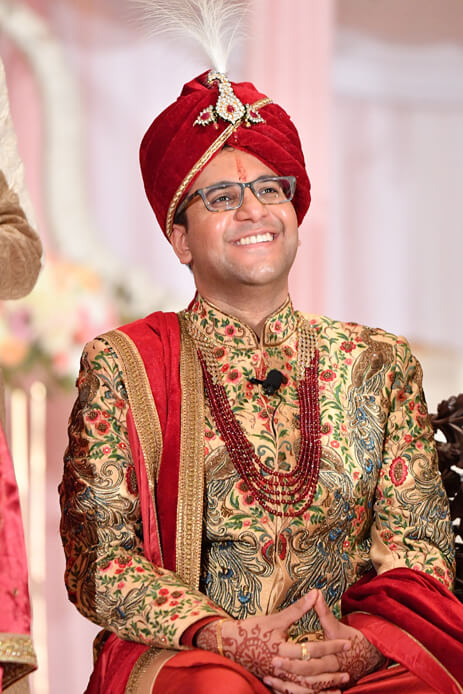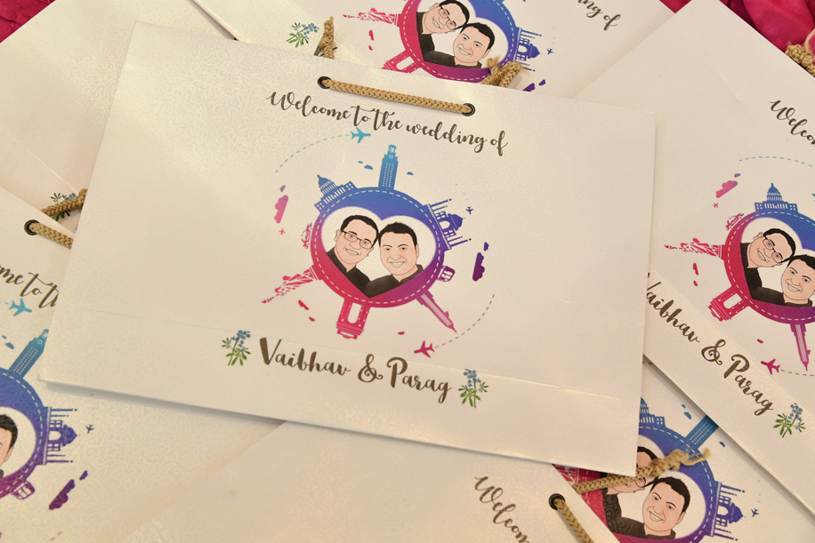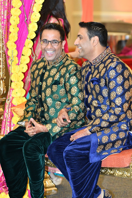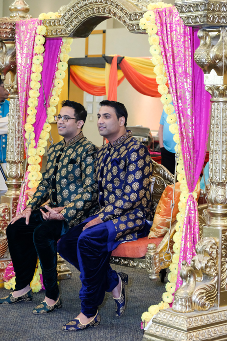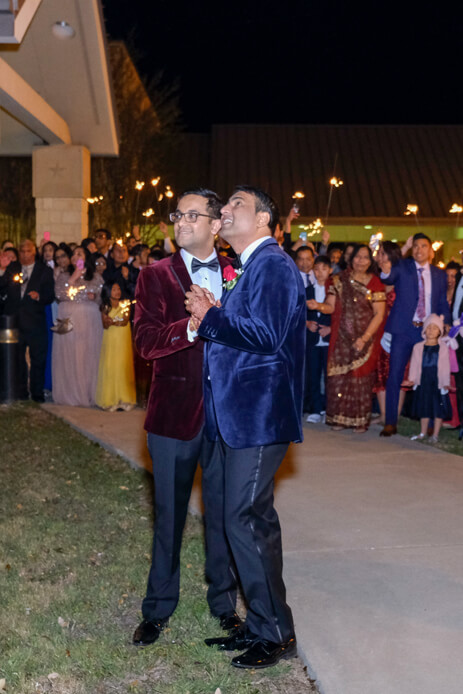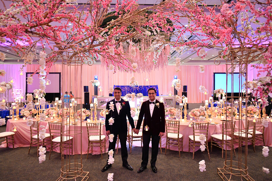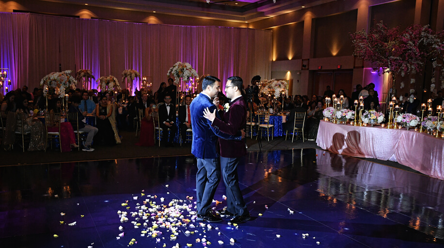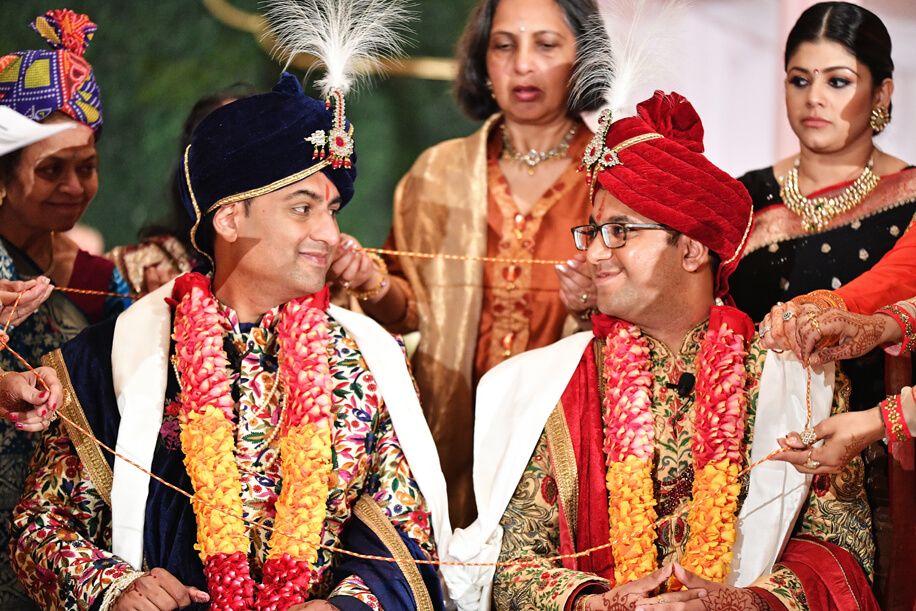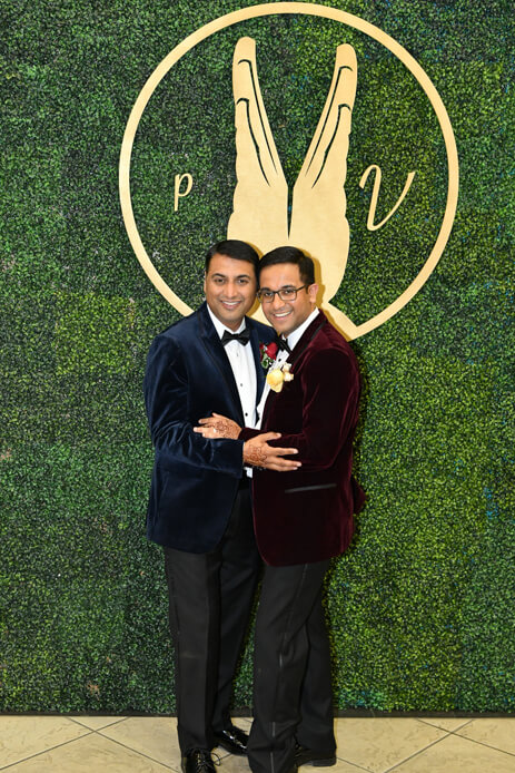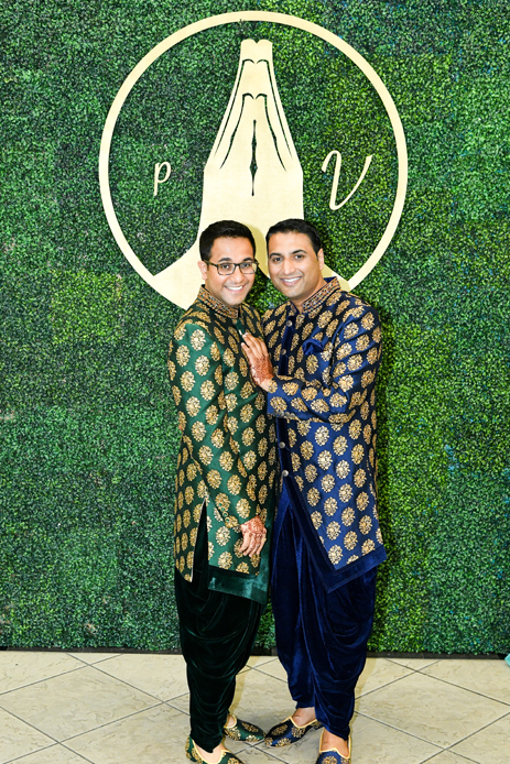 Reminiscing about the proposal that led to the wedding, Vaibhav shares, “We were over four years into our relationship, and my parents and some extended family members were also aware of us. So the obvious next step was getting married. We bought engagement bands together, but he was waiting for me, and I was waiting for him, to propose. Things were finally settled when Parag’s best friends and I surprised him on his 40th birthday with a trip to Santa Fe, New Mexico. We had a great time celebrating his milestone birthday, but little did I know that he was planning his surprise proposal to me at sunrise on the next day. He said he wanted to begin his fourth decade on Earth with me as his life partner. So, as we all went to view a breathtaking sunrise on a hilltop in Santa Fe, he turned on Facebook LIVE and began to film his surprise proposal. Thousands of our friends, family, and strangers around the world watched this intimate moment in real time. We both exchanged engagement rings and committed to spend our lives together. When he was done proposing, and the cameras were off, I suggested that we start calling everyone to share the news, but Parag just nodded and said that we don’t need to do that because almost everyone we know and love just saw this happen. I love Parag for many, many reasons But his cleverness and efficient approach to this romantic moment is high on the list!”