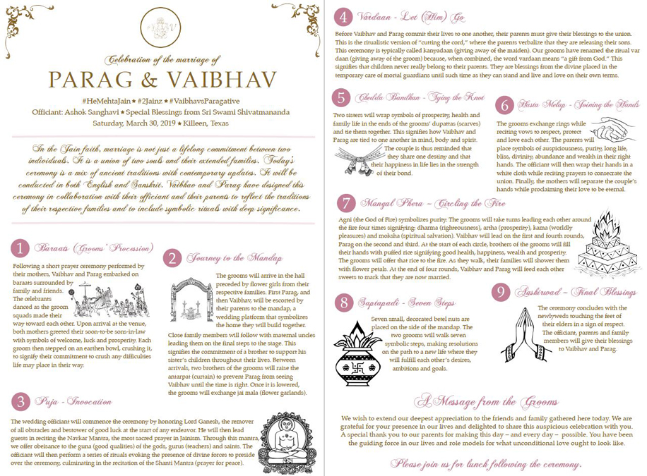 The wedding ceremony, however, included customs and rituals that were tweaked to match the distinctness of this unique Jain wedding. Vaibhav and Parag entered with their respective baraats and got their tilaks done simultaneously by their mothers. Rituals like ‘kanyadaan’ and pheras too were modified. While the former was called ‘var-daan’ which translates to ‘giving away of son’ and also means a boon or blessing. The ritual of ‘saubhagyavati bhava’ where married women give marital advice to the bride was changed to ‘chiranjeevi bhava’ with married gay and lesbian couples of the friends imparting tips on ensuring a happy marriage to the couple.