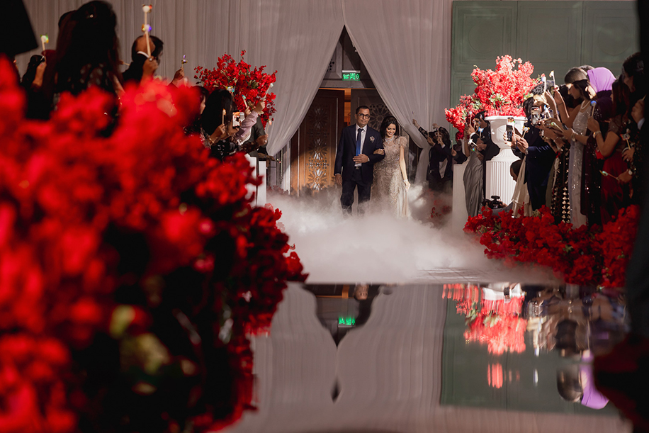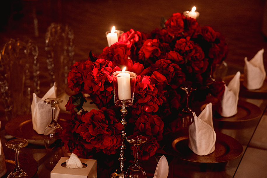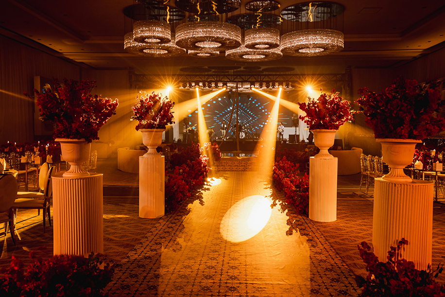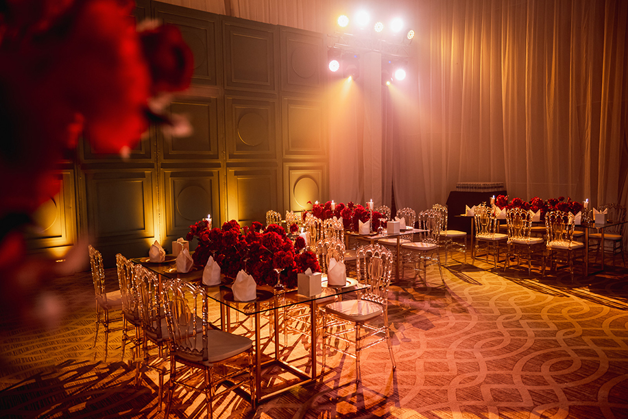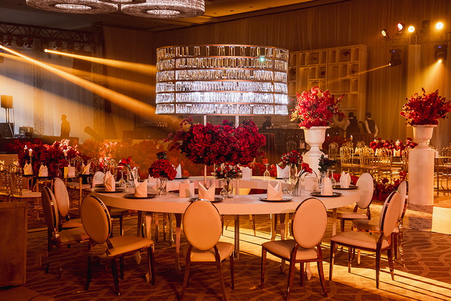 Luxuriously designed with red, gold and off-white hues, this couple’s engagement party raised the stakes with its elegance
