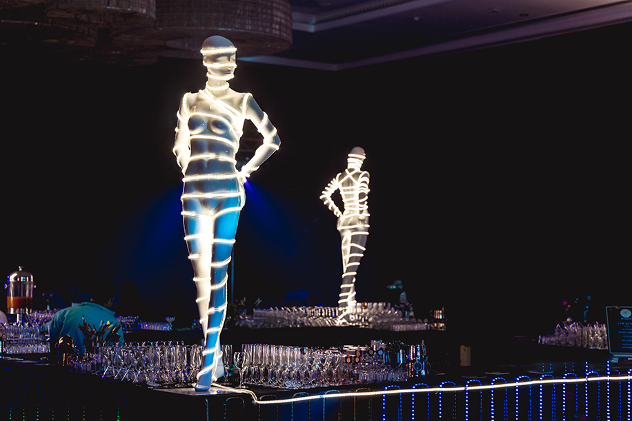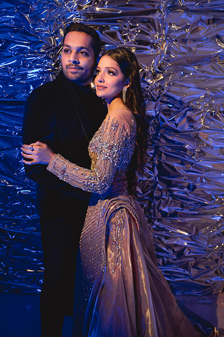 The very same day, the evening witnessed a spirited club-like party that took a cue from a dance club. Covered in black masking with silver panels with in-lit figures, the guests were in awe as they entered the venue. The couple also made a stylish entry with innovative sound and light effects.”