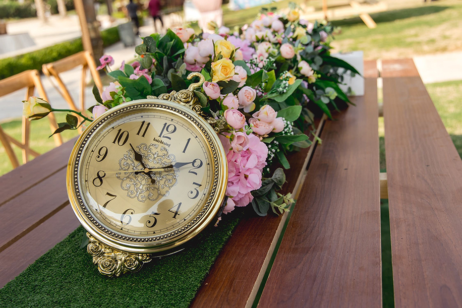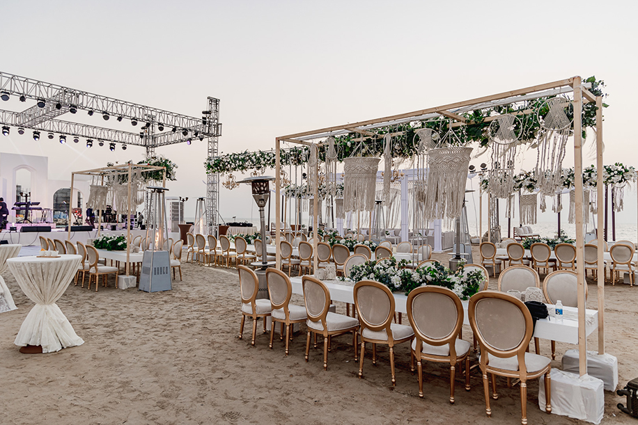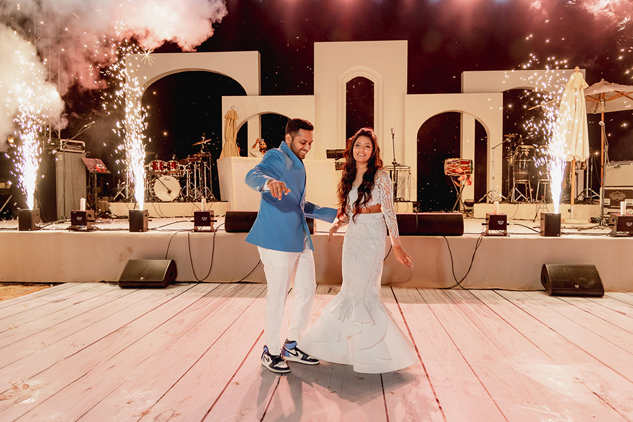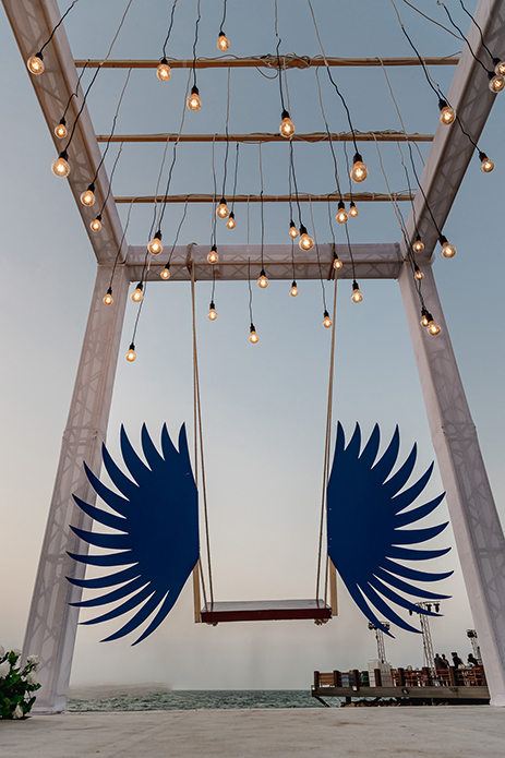 Kicking off the three-day festivities was a sundowner at the hotel’s own private island. Keen on channeling a breezy, beachside event – the decor consisted of a pristine white colour palette that contracted beautifully with the dramatic sunset sky. Adding a golden glow to the venue were fairy lights and vintage bulbs.