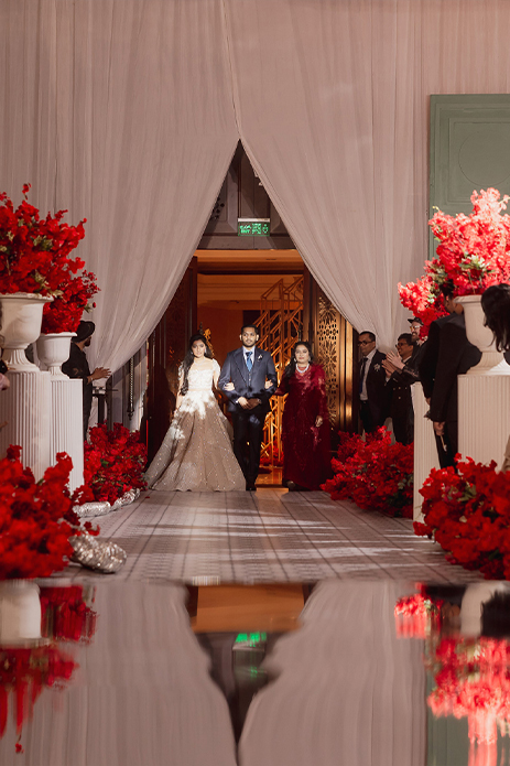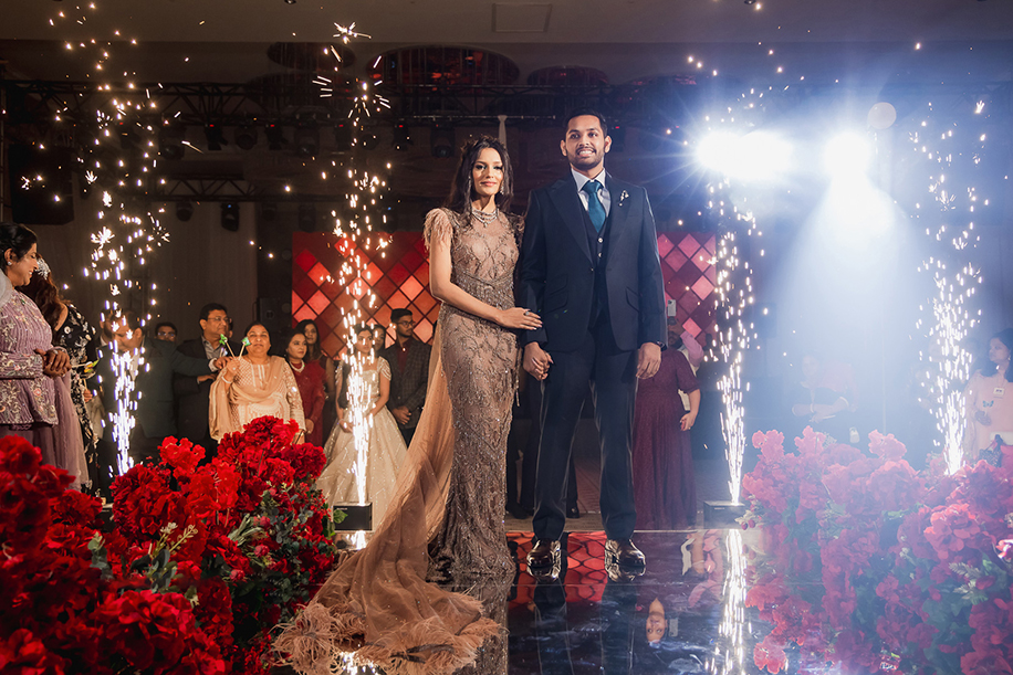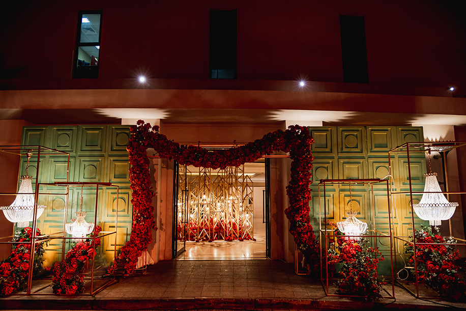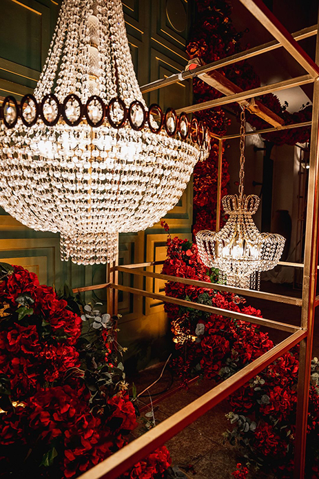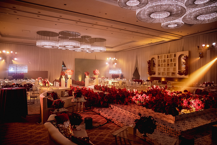 Ending the celebration in style was a dreamy yet glamorous engagement. Varun shares, “Since this was the moment that everyone had come to celebrate, everything just had to be perfect. We wanted to combine the best of romance and glitz. Thankfully, we were successful as we constructed an aisle on which the couple walked and a raised platform on which they exchanged rings. The color palette of the design consisted of red, gold and cream hues which gave the entire ballroom a luxurious look. Scarlet roses filled the air with their heady scent while crystal chandeliers cast a gold glow over the couple as they exchanged rings.”