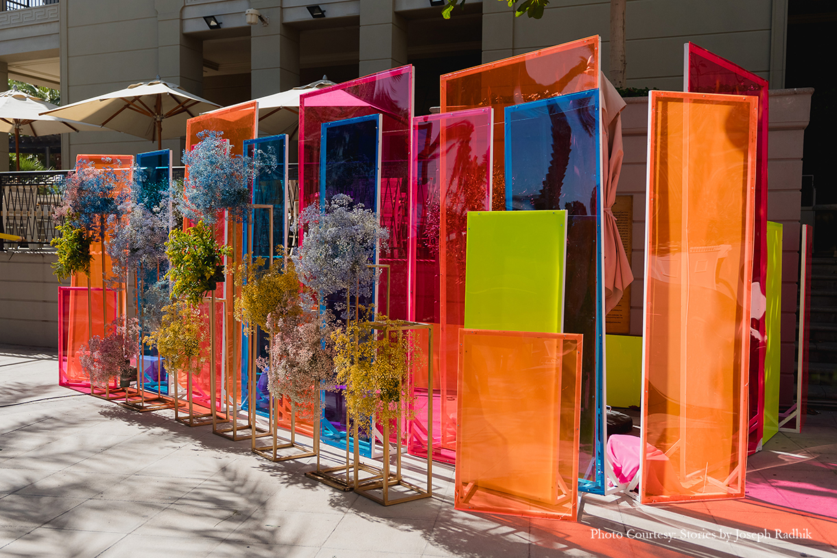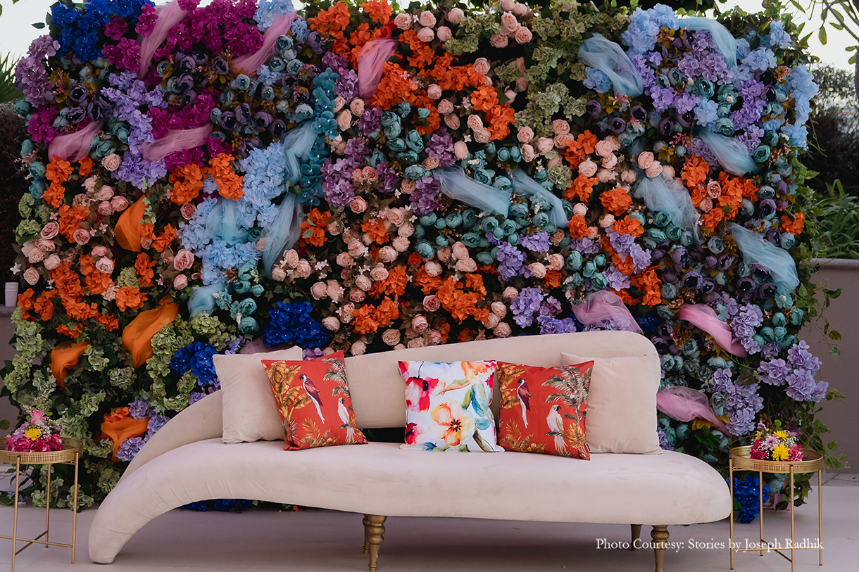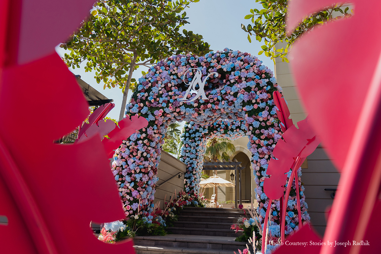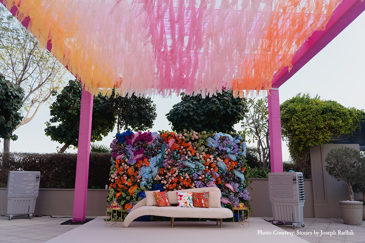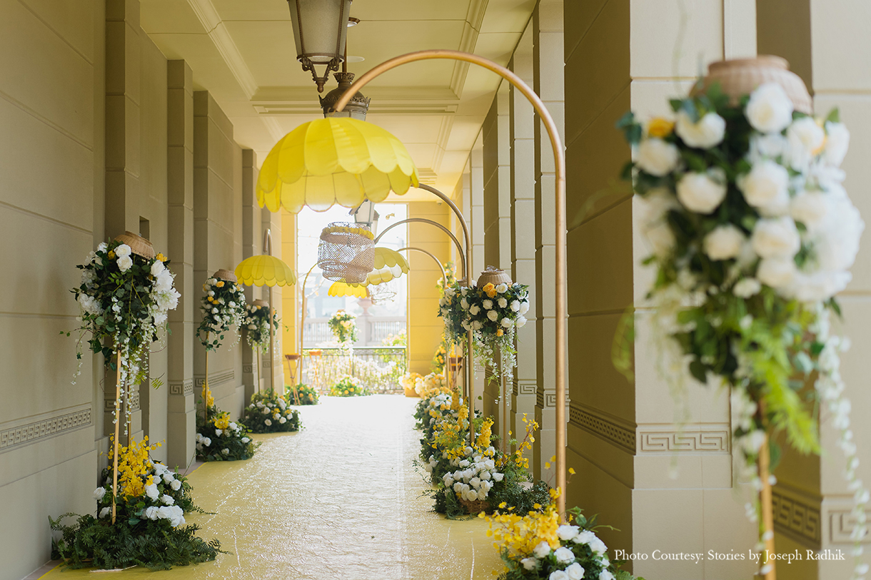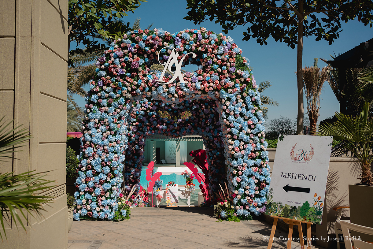 Aashay from Tamarind Global shares, “After the welcome dinner, the mehndi was a vibrant celebration where henna-patterned palms and the buzz of excitement had everyone smiling. Baby blue and pink floral arches added a whimsical touch to the event and welcomed the guests. Adding to the vibrancy were large pink banana leaf installations that stood out against the surroundings.”