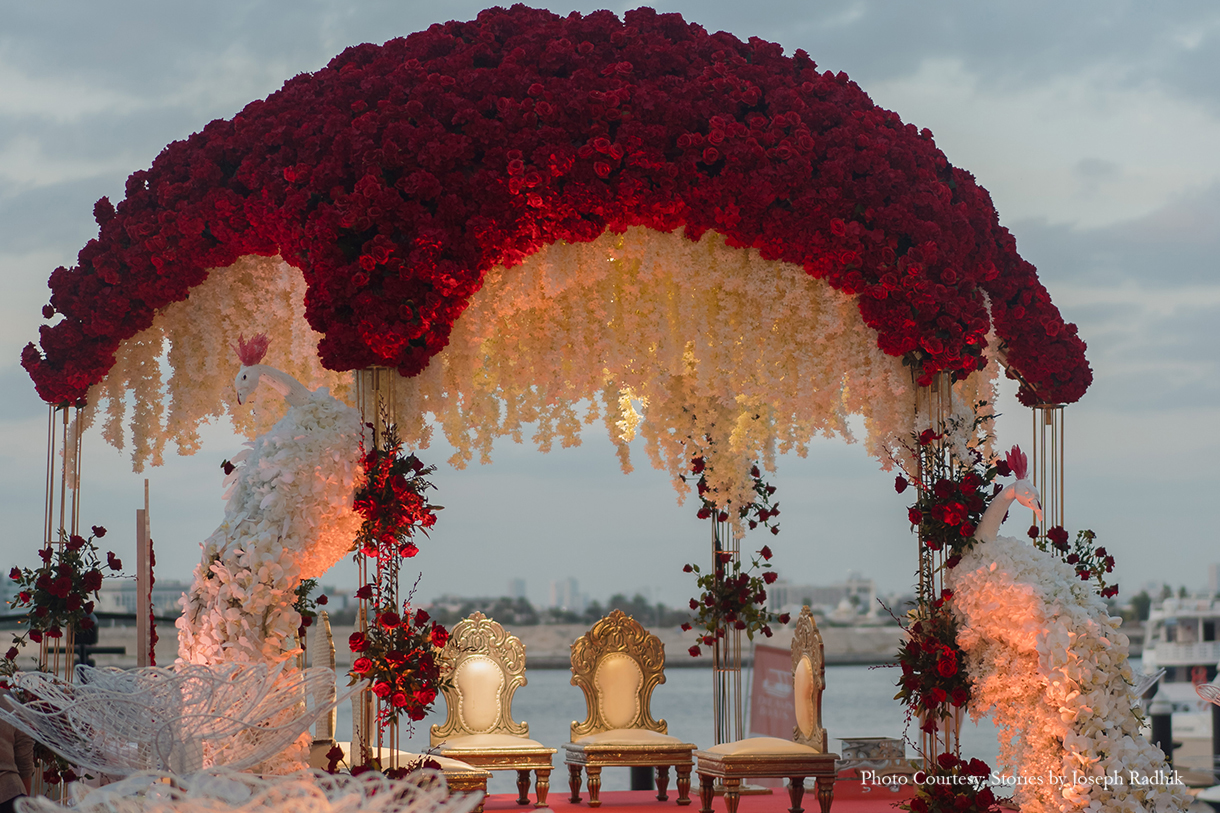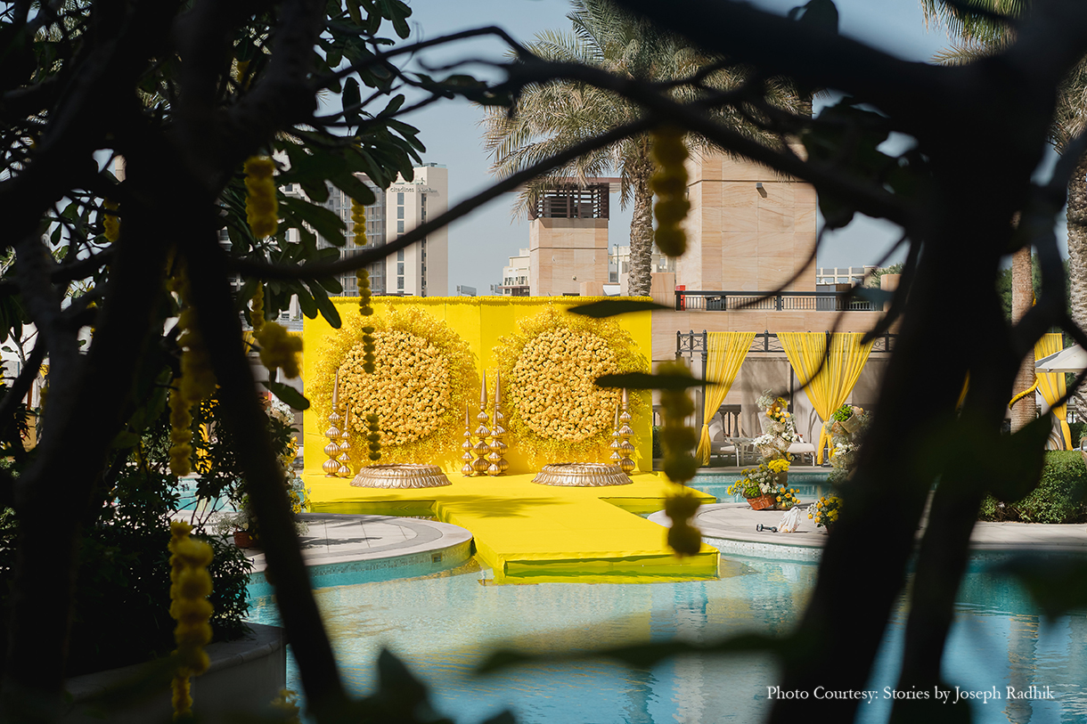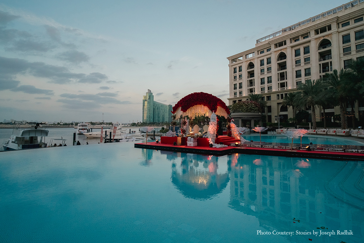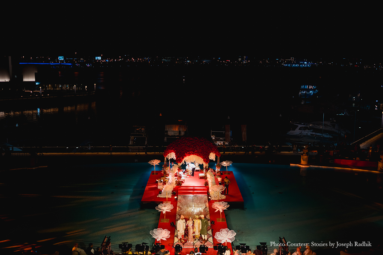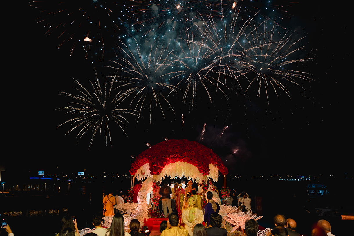 Saving the best for the last, the wedding was a dream come true. And, the highlight of the big day was the floating mandap placed on the venue’s vast pool. Giving the couple a serene backdrop of Dubai Creek as they tied the knot, the mandap was the perfect combination of grandeur and elegance. Adding to the magic were fireworks that lit the sky up as the couple exchanged garlands and took their pheras.