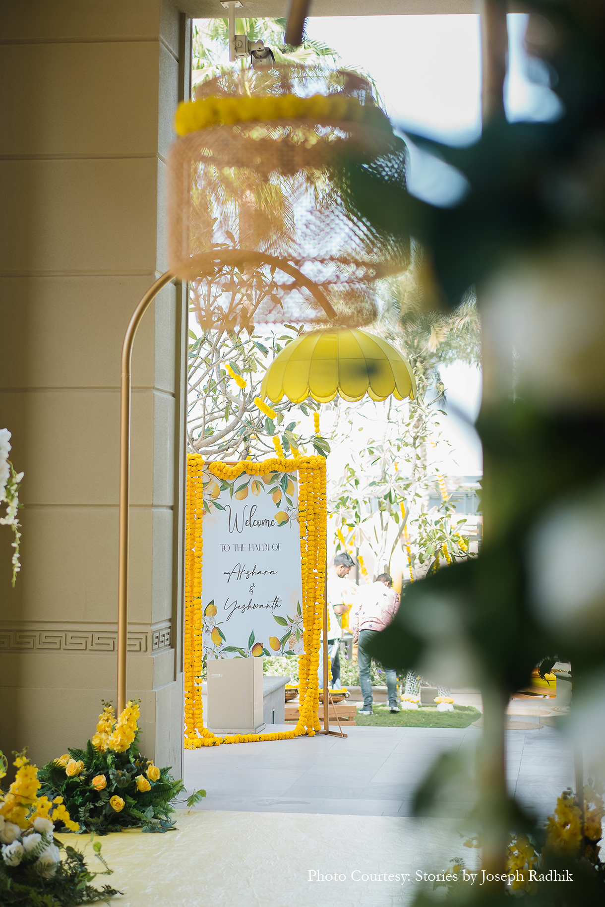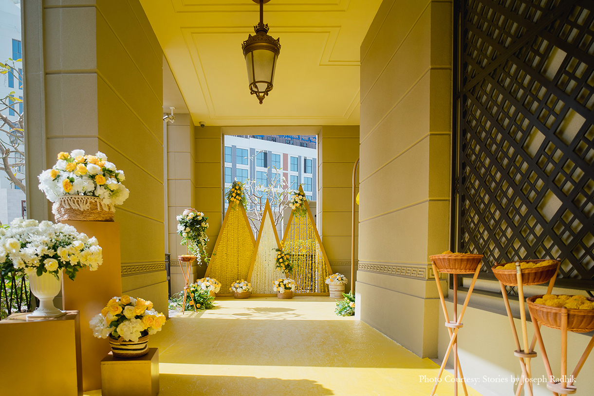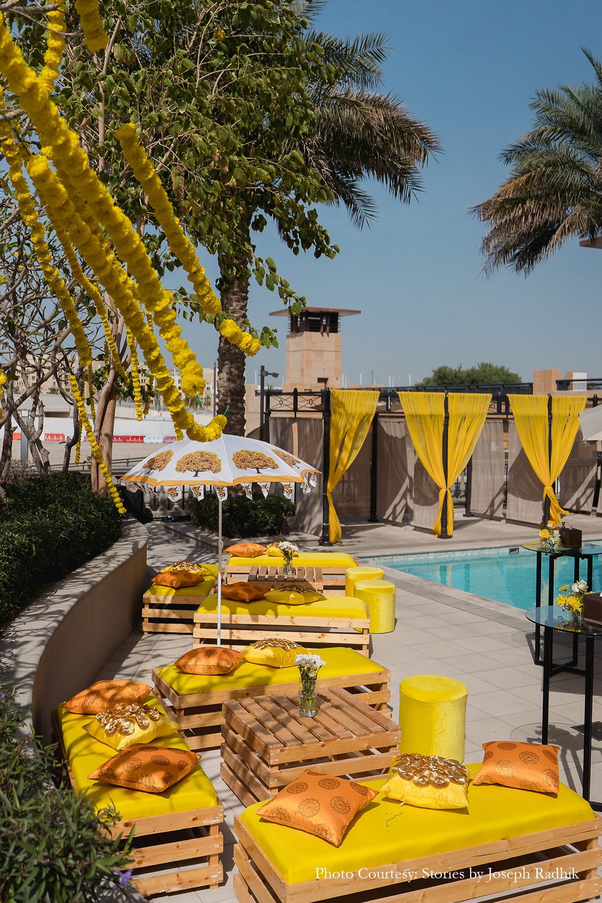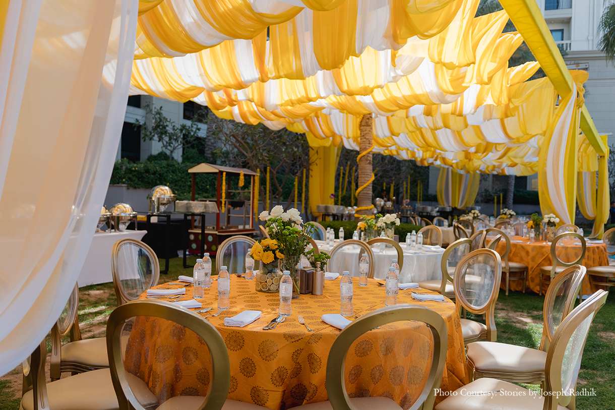 Kicking off the wedding festivities was the haldi which saw a beautiful yellow and white theme that was accentuated with gold elements. Everyone had a fun time as they exchanged playful banter and lively moments. Rustic tepee-like arches with marigolds, wood furnishings and parasols adorned the venue creating a cheerful atmosphere for the guests who enjoyed their time under the sun.