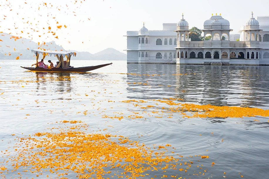 Glide over the serene waters of Lake Pichola in Udaipur, where the surrounding lush hills and the white marble facade of the Taj Lake Palace bear witness to your special moments.