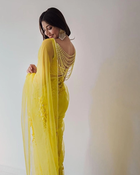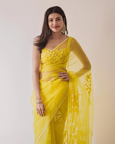 Newly wed actress Kajal Aggarwal took to Instagram to share moments from her engagement festivities in June earlier this year. She picked a sheer organza saree by Manish Malhotra in the color “Tuscan Yellow” that the talented designer declared as the color of the festive season and we are ready to get behind this color trend.