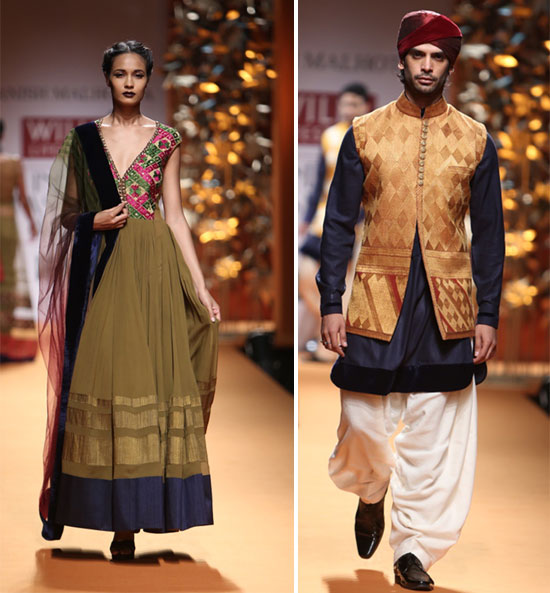 Manish Malhotra’s Autumn-winter collection Threads of Emotion was a reinterpretation of Phulkari embroidery and we saw a beautiful lineup of saris, anarkalis, floor length anarkalis and angarakhas in autumn colors like rich mustard yellow, navy blue, deep rust, earthy olive and intense red. A Manish Malhotra show is never complete without beautiful bandhgalas and kurtas. Grooms-to-be might want to take notes.