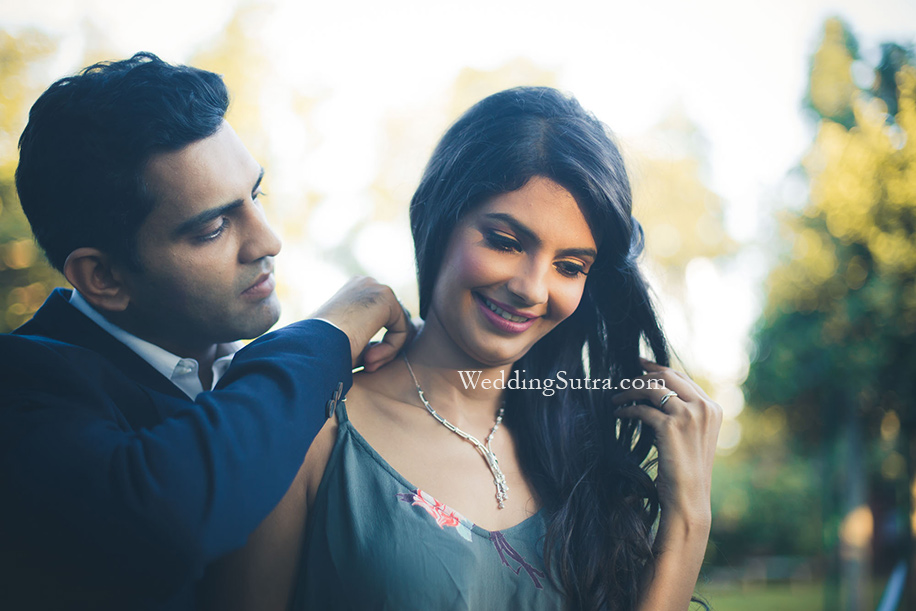 They couple also loved the platinum love bands they wore at the shoot. Ashish mentions how he’d planned to buy Manmeet one, inspired by WeddingSutra, “I was aware of the Platinum Day of Love and thought it was a great concept. In fact, I’d planned to give Manmeet a platinum band at our engagement but due to a change of plans, I couldn’t go ahead with it. Still, we loved the jewellery we wore today, simple, subtle and well designed.” “Yes, the jewellery was stunning but I love the ring in particular. It is something that can be worn casually as well as for formal events. I have already enquired about the price of the ring and the necklace and hope to buy it soon,” adds Manmeet.