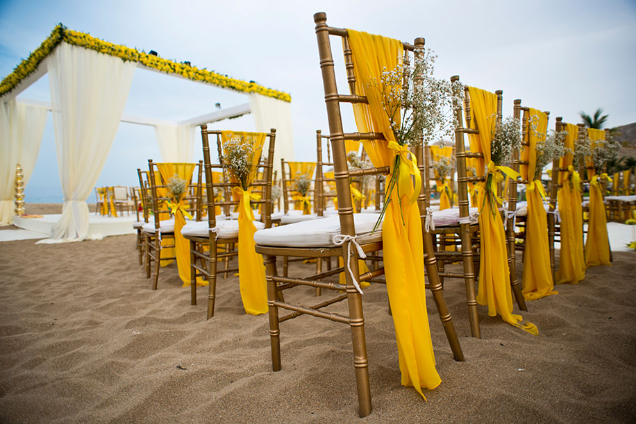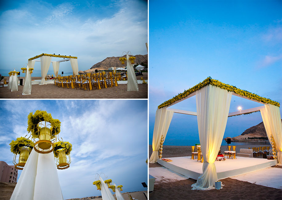 Their ‘mandap’ was a minimalist yet elegant one with aqua drapes on the corner pillars of a white wooden frame fringed with dainty yellow daisies and green foliage. This setup was brightened with splashes of yellow fabric and bows fixed behind every chair facing the ‘mandap’, and looked stunning against the crystal-clear blue waters of the Sea of Oman, rocky formations rising out of the sea and a crimson sky at sunset.