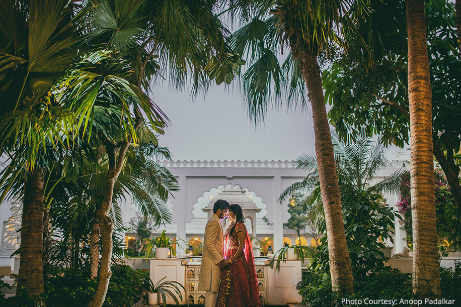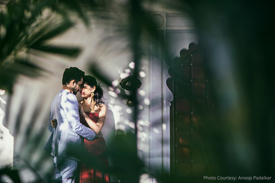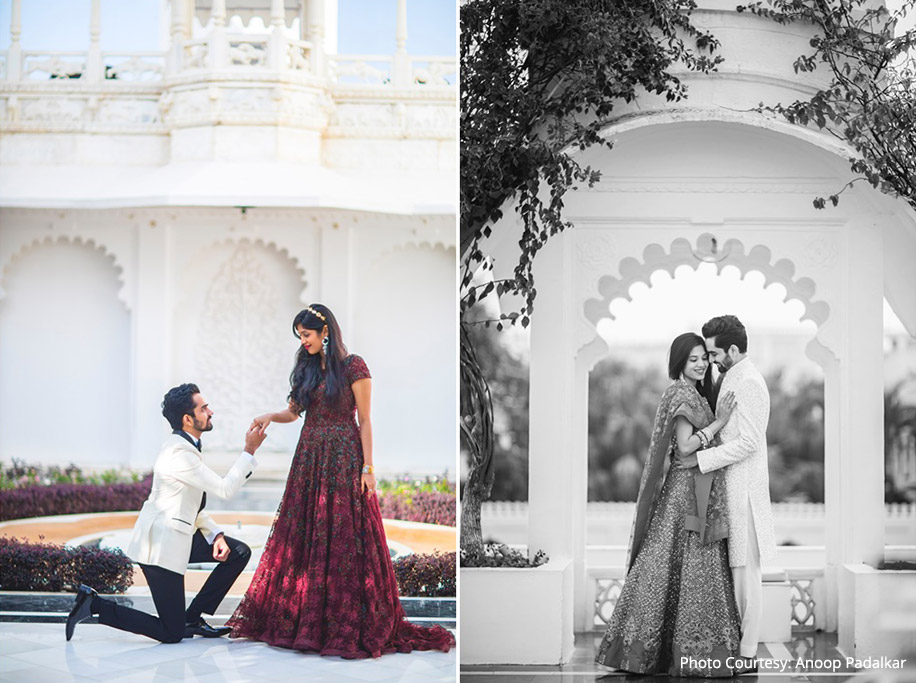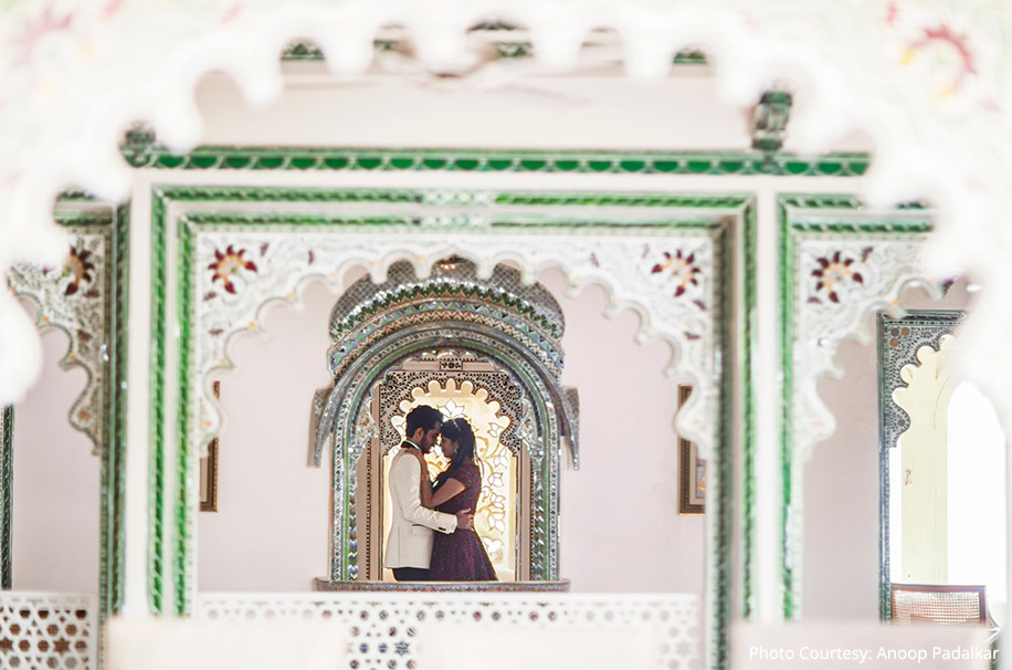 “The biggest challenge for us was getting permission to shoot at the beautiful Taj Lake Palace in Udaipur which we had chosen as our pre-wedding shoot location. Thanks to a friend, we managed to sort it all out, and the process took almost a month. A lot of intricate details were worked out very quickly. For our theme, we combined traditional, elegant, and royal elements, and picked our outfits accordingly. We were very happy with our photographer Anoop who helped us throughout the shoot. Initially, it was a little challenging for both of us to face the camera, but Anoop helped us feel comfortable. The palace was so pretty in itself that we did not really source many props for the shoot. The warm hospitality of the staff there made the entire experience even more memorable for us.”