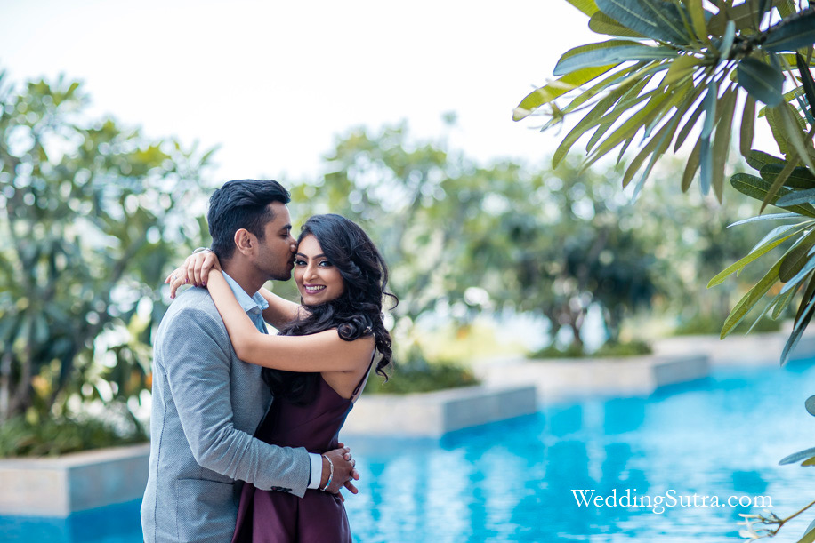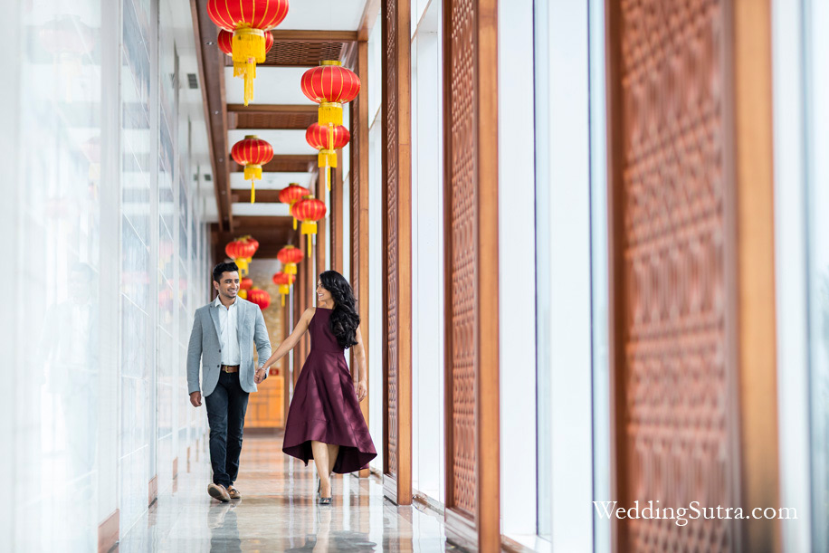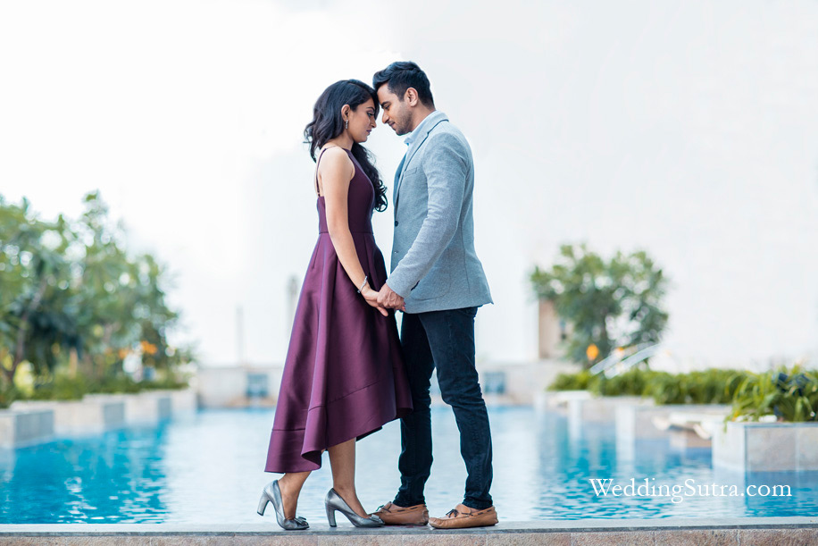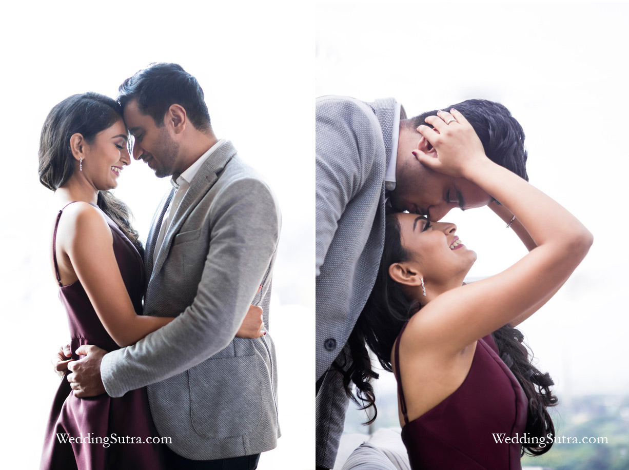 Our Love Actually series captures beautiful moments between couples in the most stunning locations across Mumbai, Delhi, Hyderabad, Bengaluru and Chennai. Here, bride-to-be Mehal shares her cute love story, and photographer Ankit Singh captures the nuances at a beautiful shoot organized at the luxurious Shangri-La Bengaluru. Mehal’s hair and makeup were done by Zorain’s Studio, and she is wearing platinum jewellery by Abaran, Bengaluru.