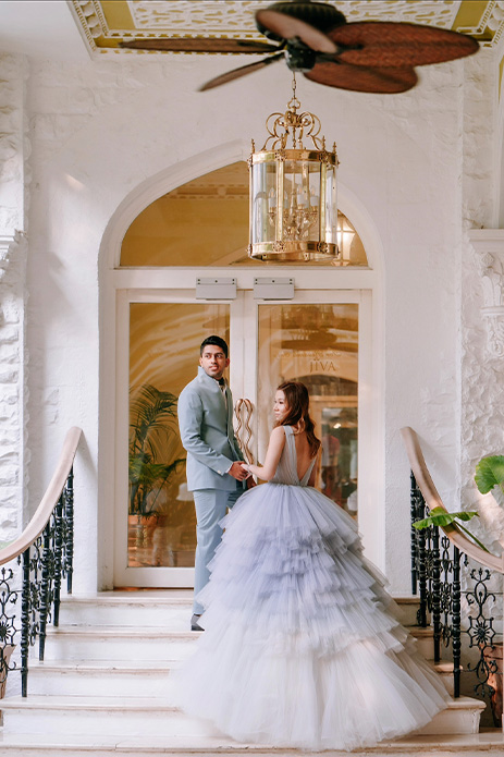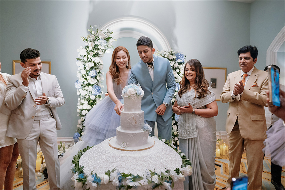 Hosted at The Taj Mahal Palace in Mumbai at one of its spacious indoor spaces, the engagement fused the beauty of Indian vibrance with Japanese elegance. Blue and white hues dominated the colour palette. And, as the couple walked in, they were greeted by loud cheers. An asymmetrical floral arch framed the couple as they cut the cake – a stunning three-tiered creation that was in sync with the decor theme and bore the duo’s initials. Additionally, the couple took the opportunity to capture some candid pre-wedding shots of themselves surrounded by the colonial charm of the venue. As they explored The Taj Mahal Palace’s historic interiors, the duo had a fun time sharing playful banter while feasting their eyes on the majestic Gateway of India.