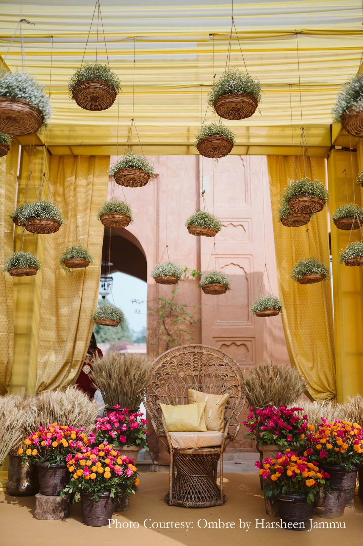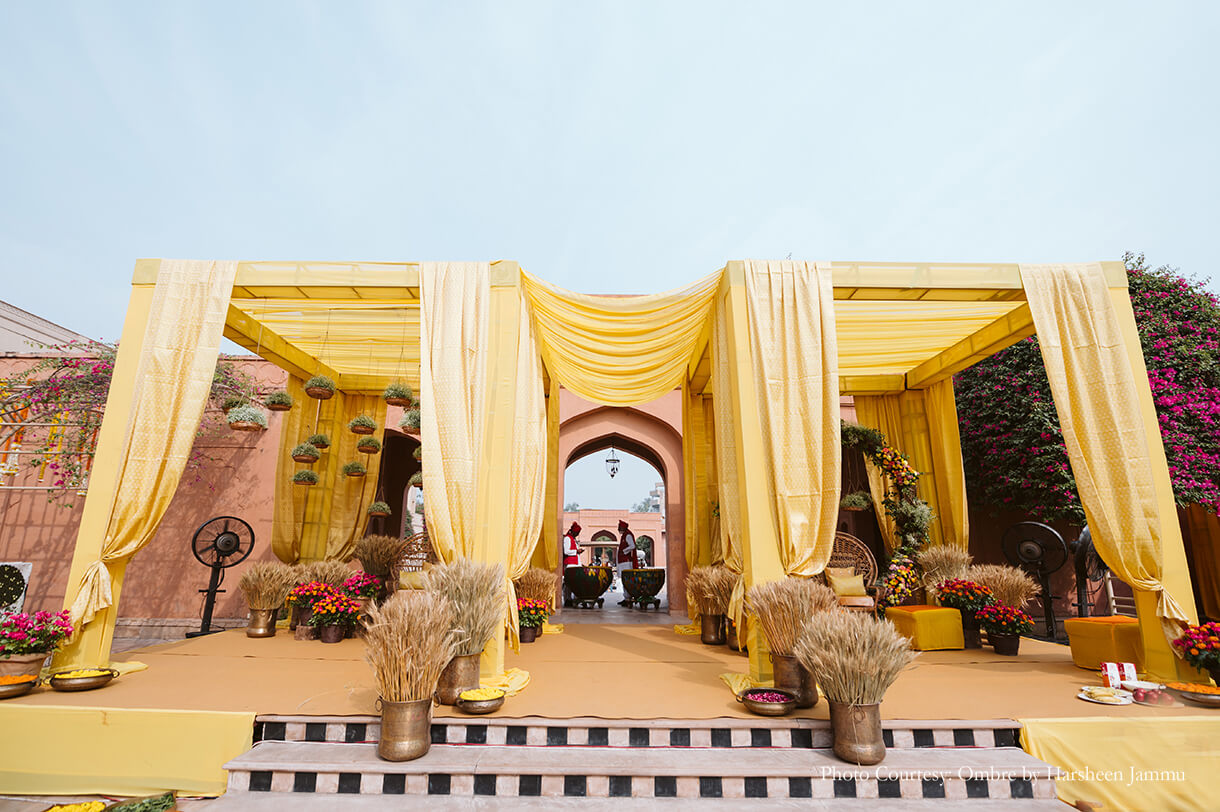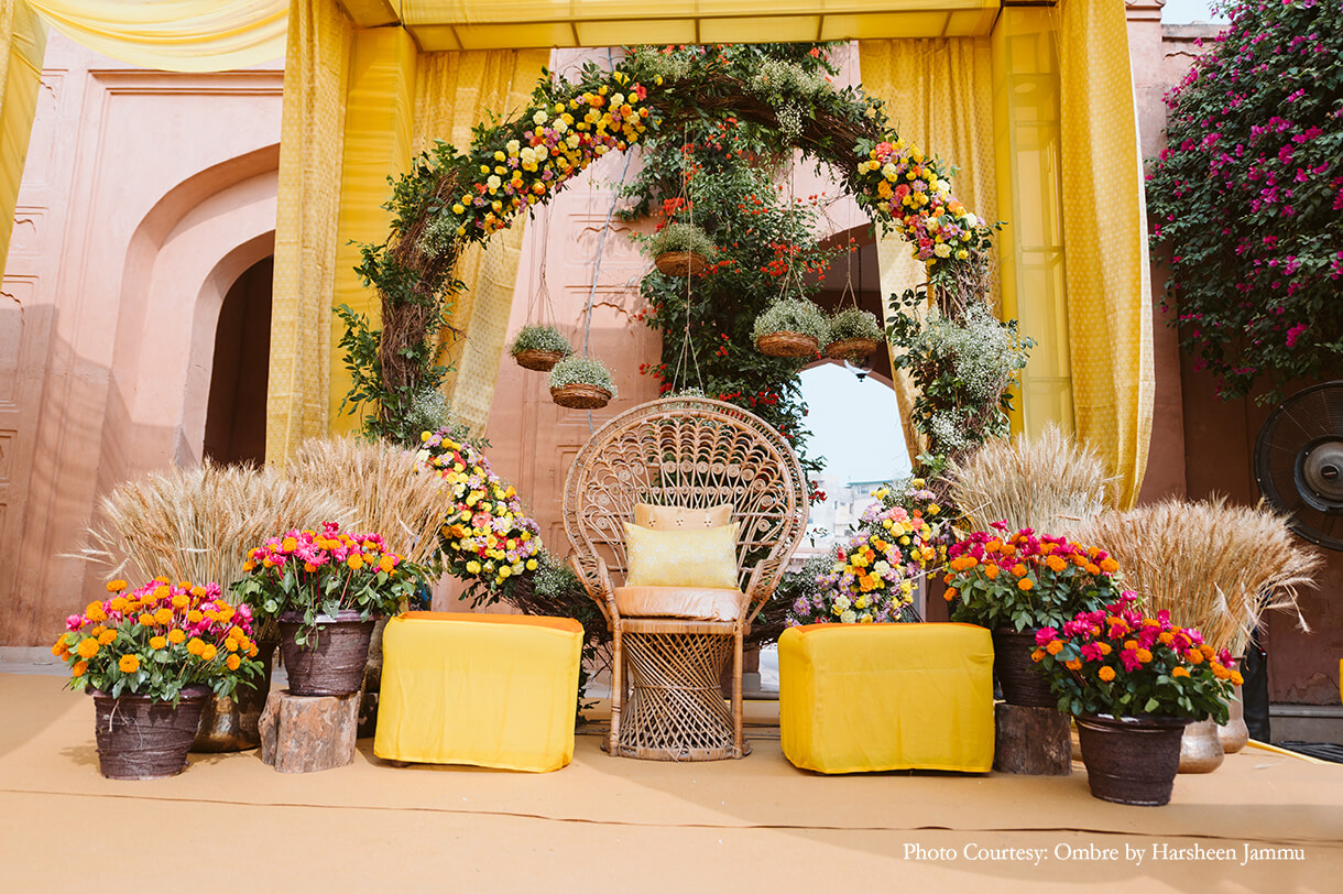 As customary, the haldi was swathed in hues of yellow which were accented by cane baskets that were brimming with baby’s breath blooms. This combination of white and yellow interspersed with earthy hues created a soothing colour palette that looked beautiful under the afternoon sun.