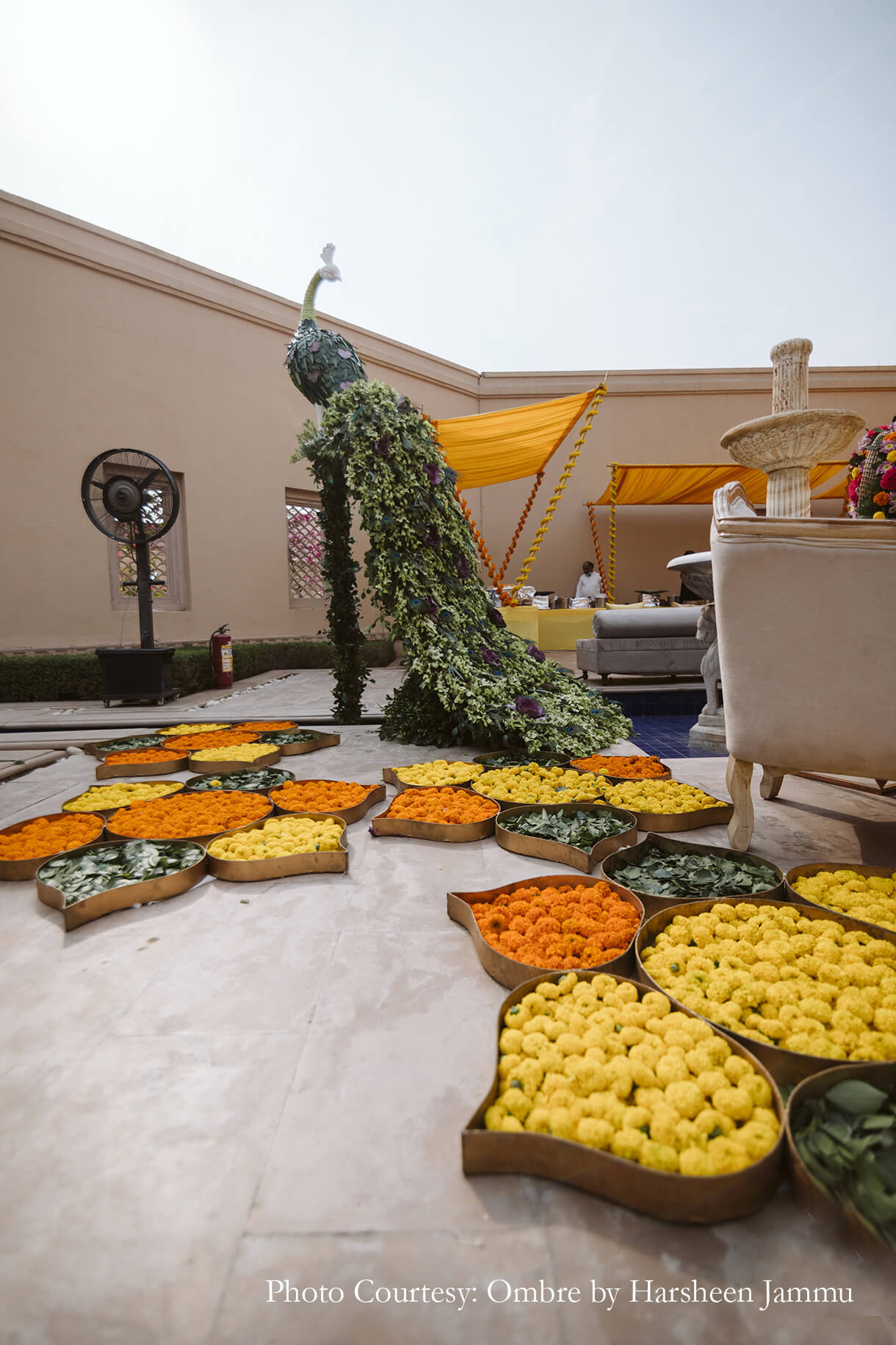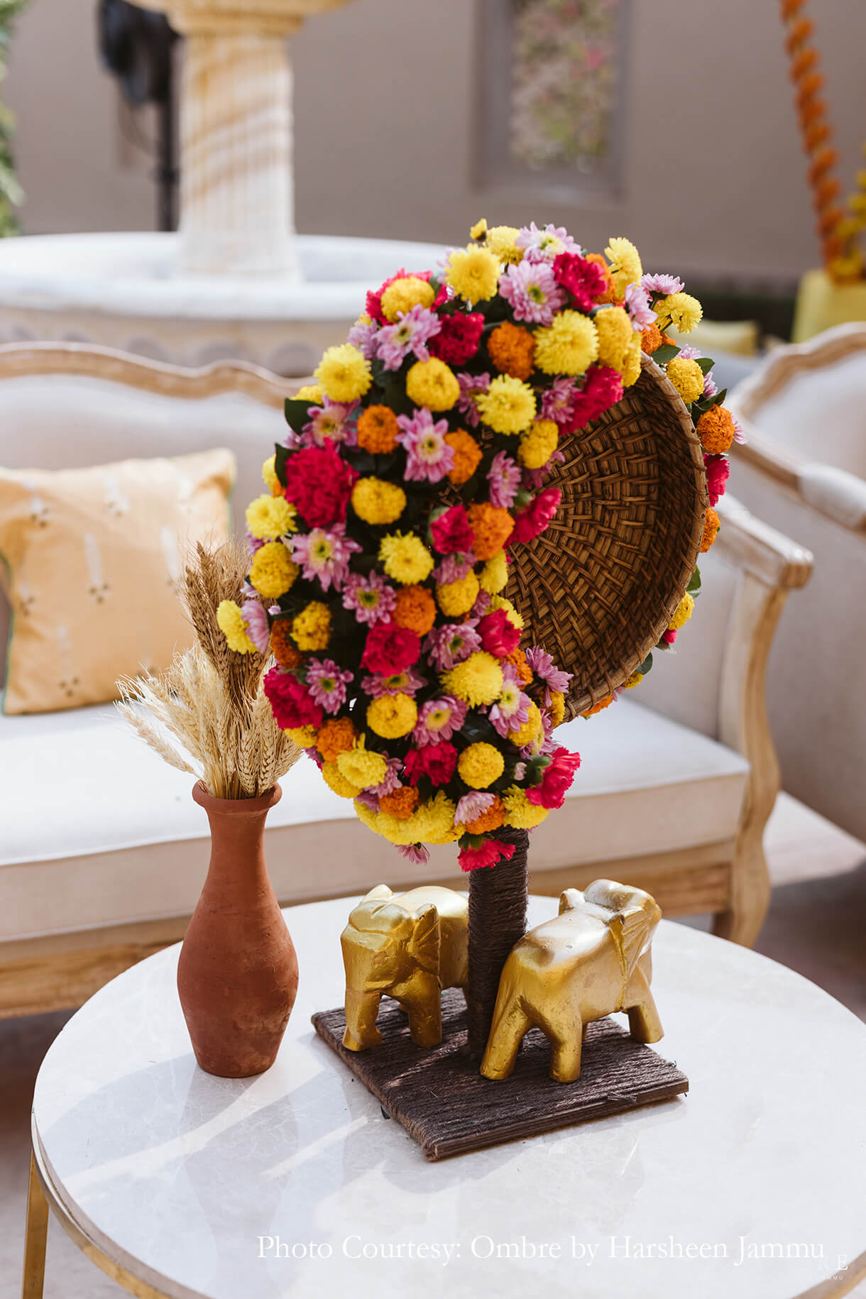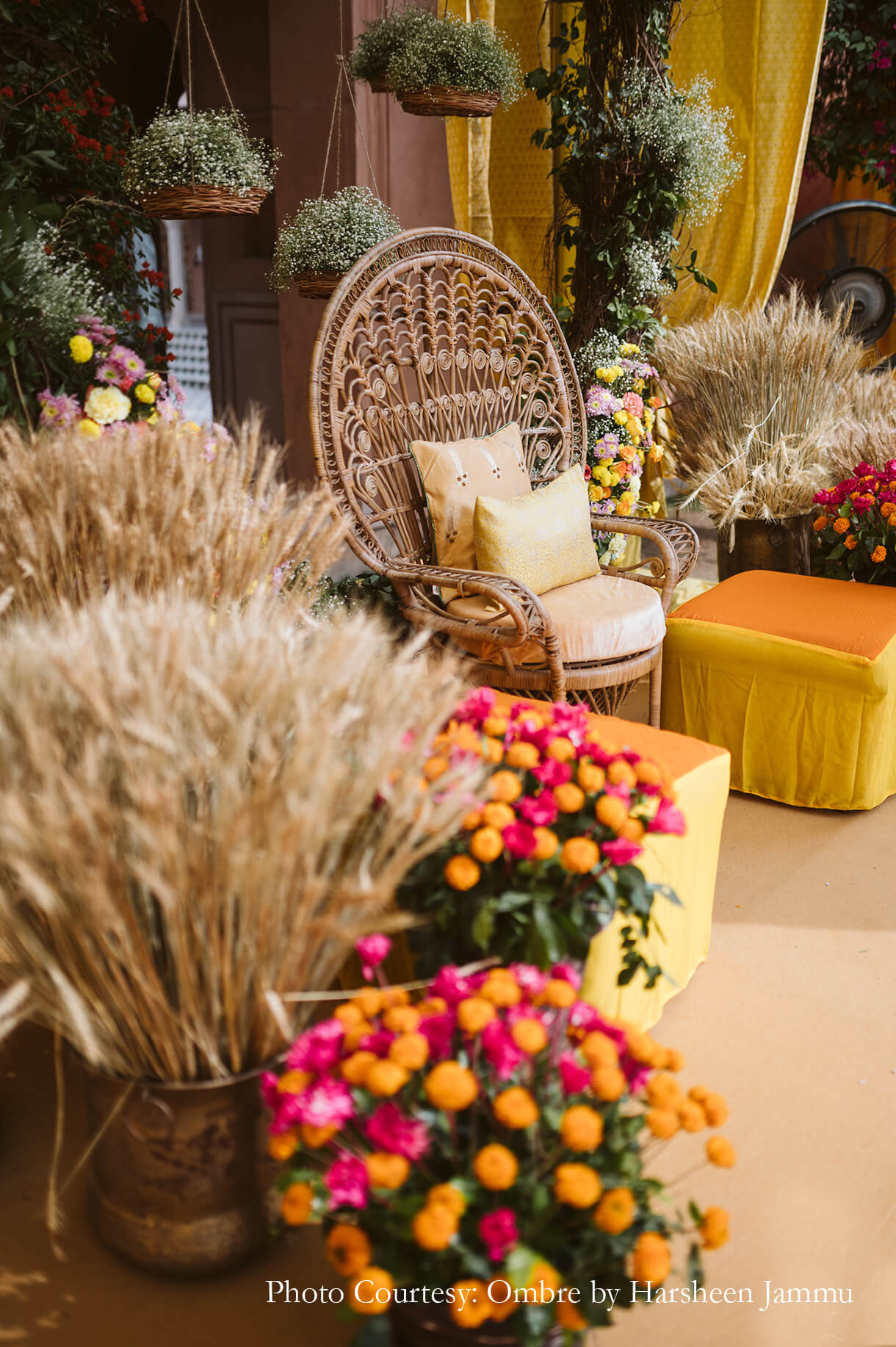 As customary, the haldi was swathed in hues of yellow which were accented by cane baskets that were brimming with baby’s breath blooms. This combination of white and yellow interspersed with earthy hues created a soothing colour palette that looked beautiful under the afternoon sun.