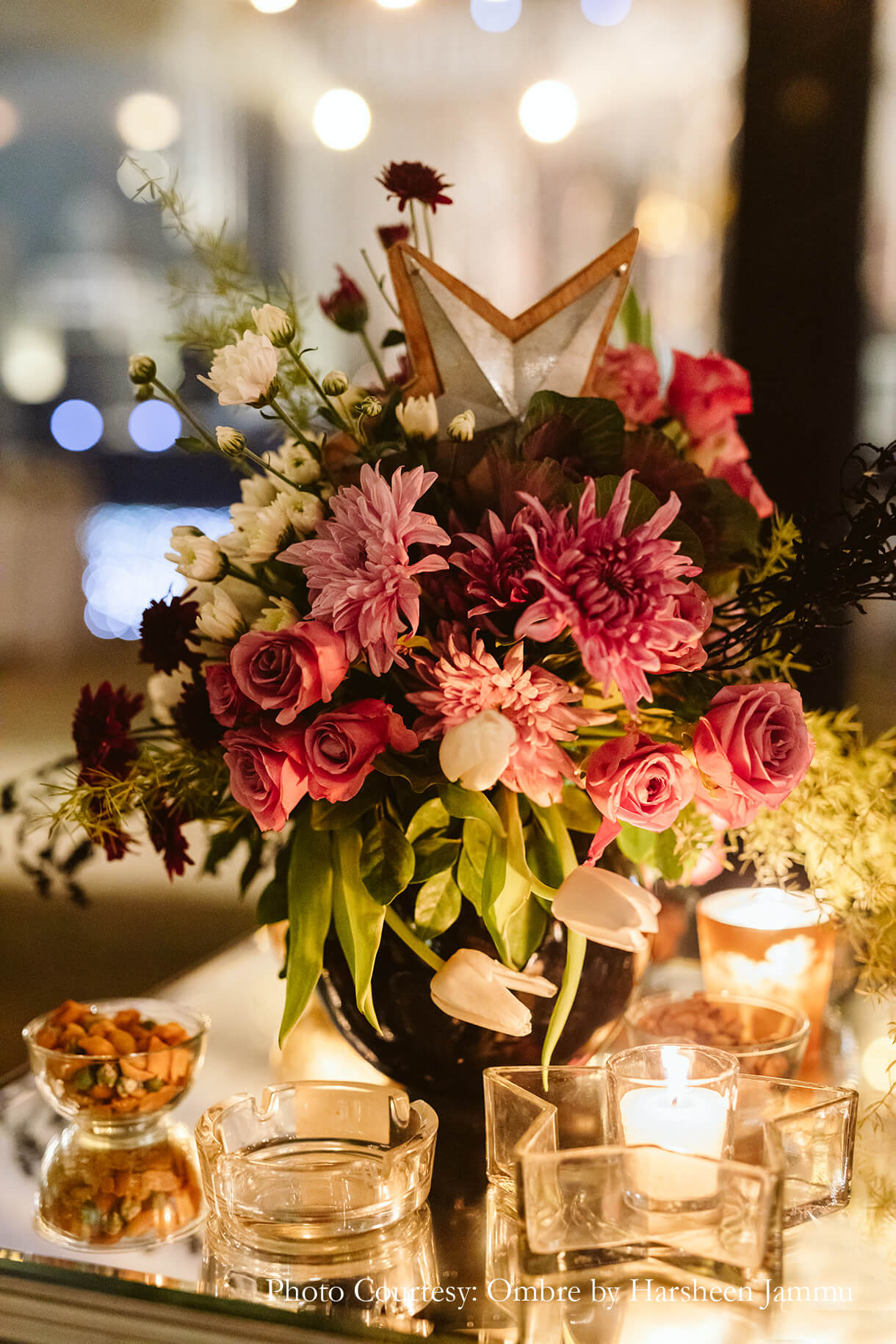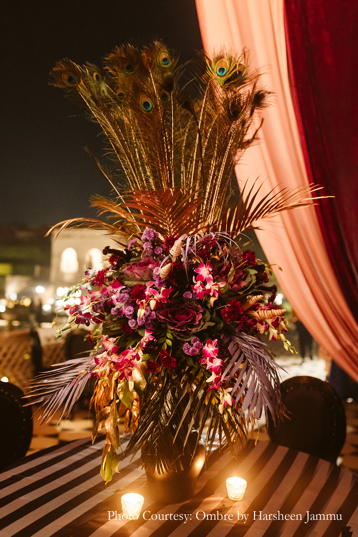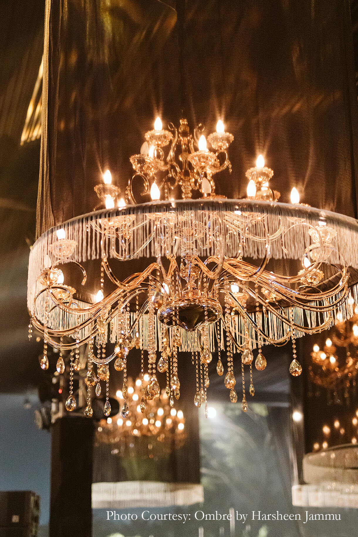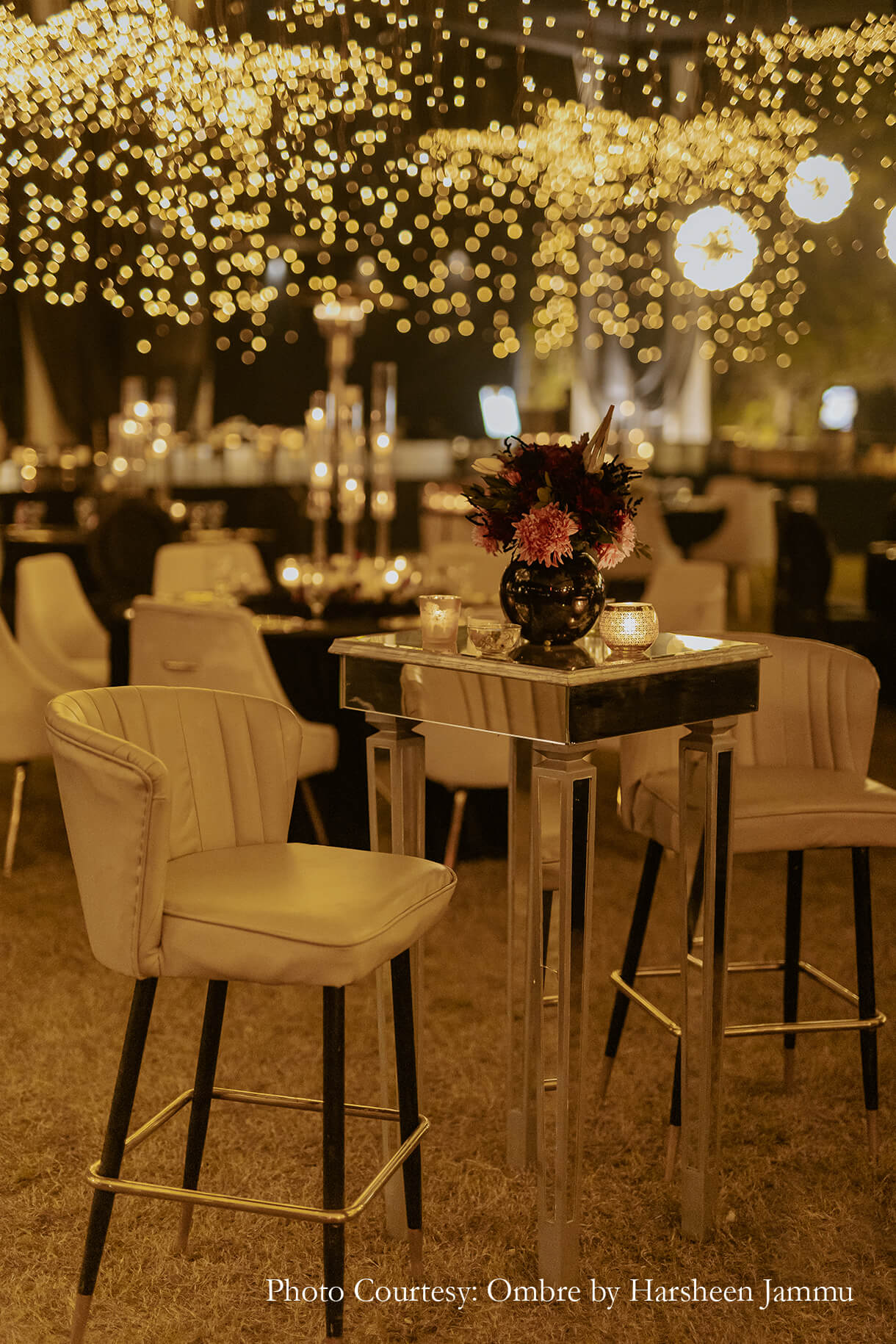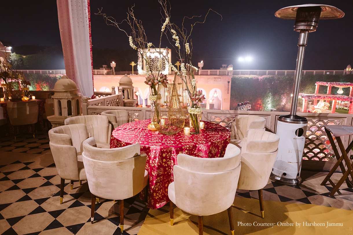 “As night fell, we transitioned into a more glamorous version of ourselves at the cocktail night. The event looked magical with its huge chandeliers, candles and floor lanterns. However, the highlight was the entryway which was decked up in candles creating a dreamy atmosphere”, shares Swasti.