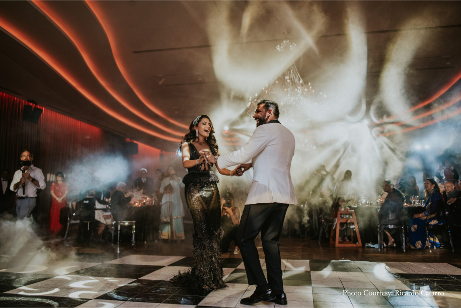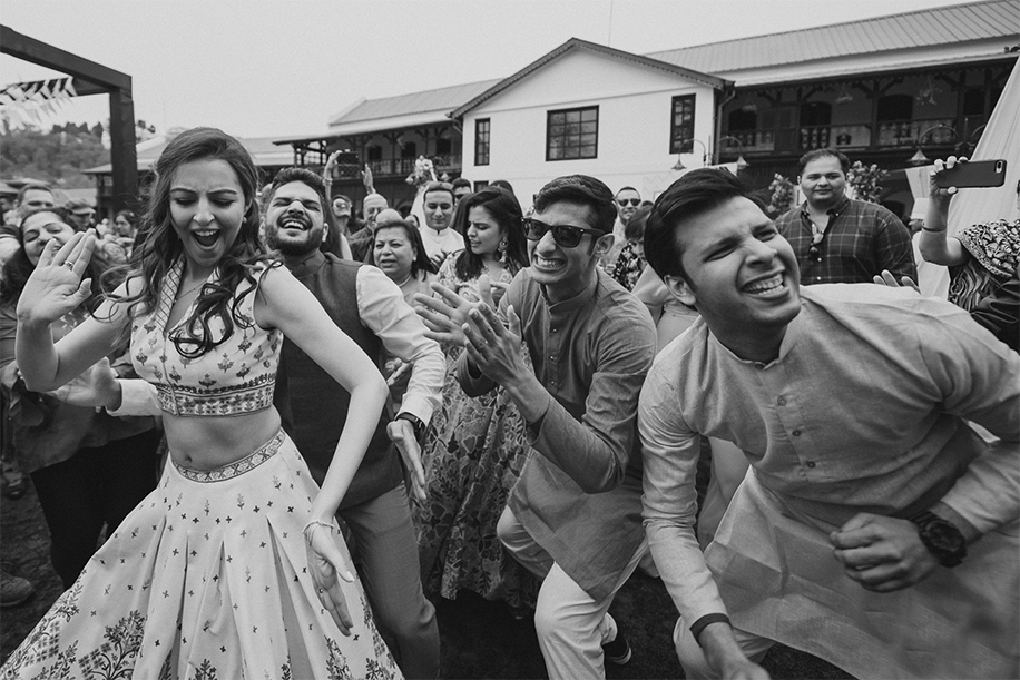 The couple and their loved ones at the sangeet, setting the dance floor on fire.