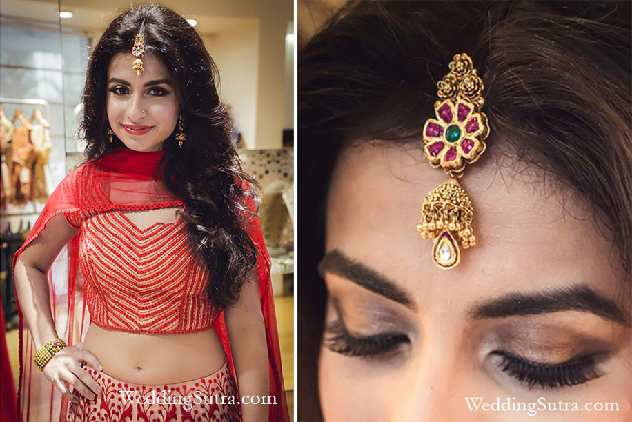 2. Classic Azva gold Matha Patti Maang tikka in a vibrant design
