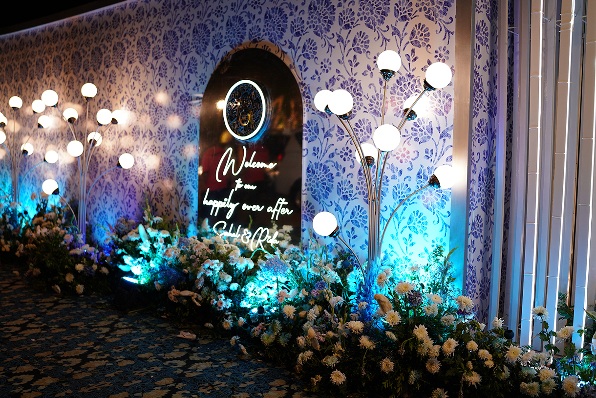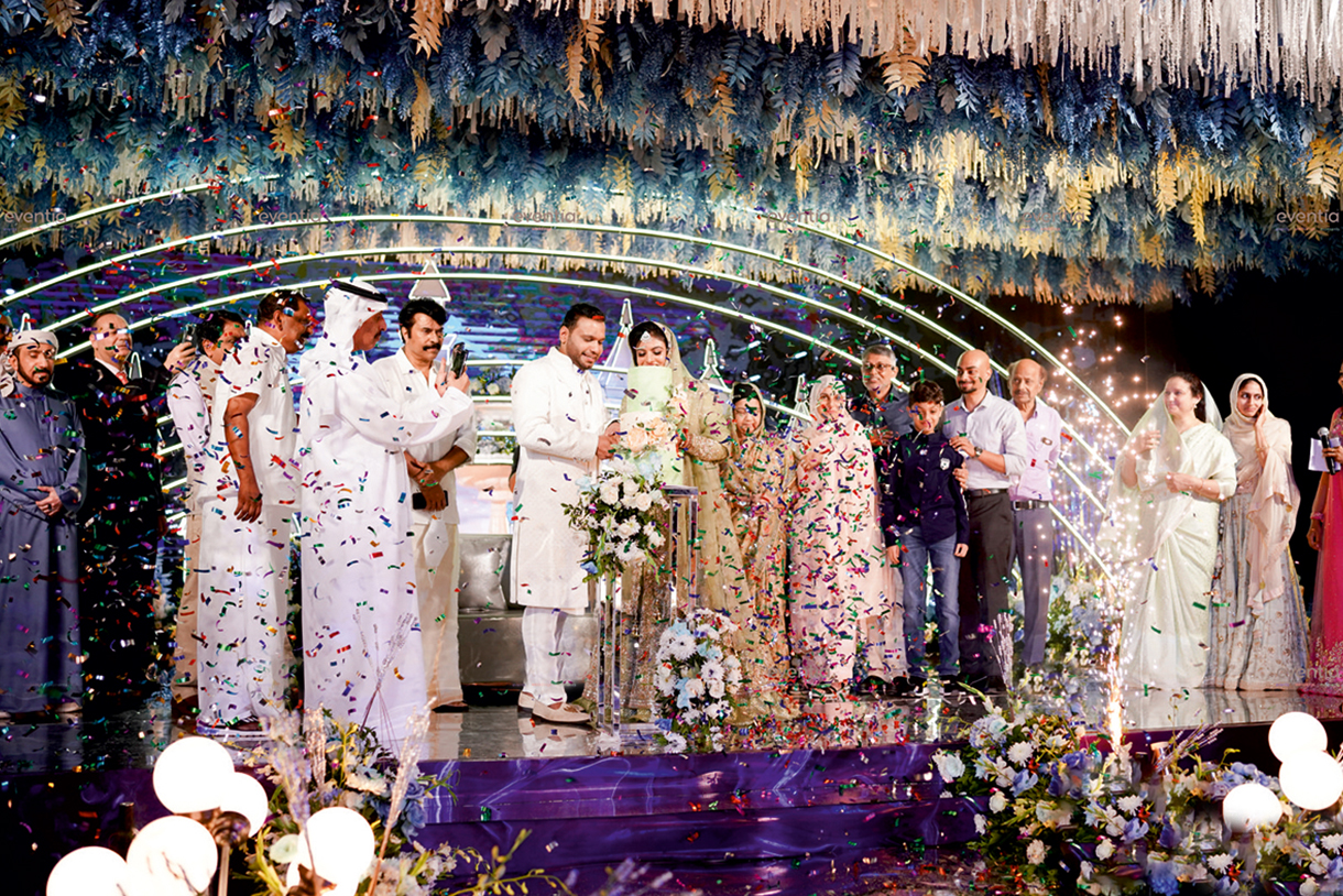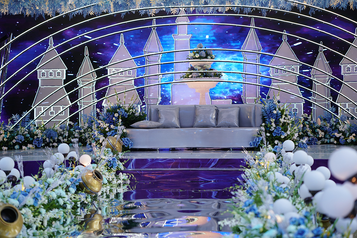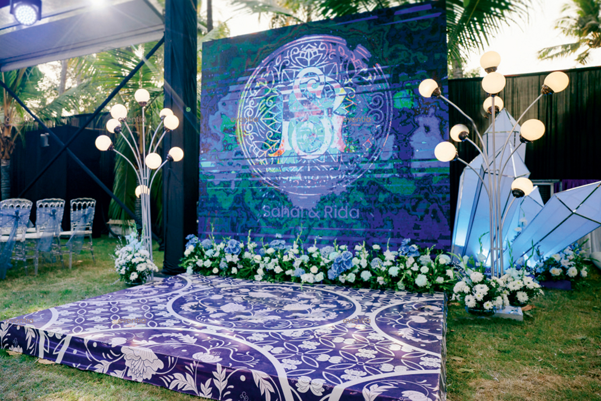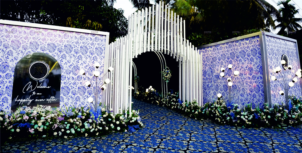 Stepping away from color schemes, themes, and entertainment frequently witnessed in luxurious Muslim weddings in Kerala, blue was chosen as the focal color, serene yet celebratory at the same time. Dubbed the “Blue Mist”, the evening was conceptualized as dreamy and tranquil where the misty December night would play its part. There is always a sense of magic associated with misty blue skies, and the planning team used this to bring a sense of anticipation and thrill to what was going to be a truly magical night.