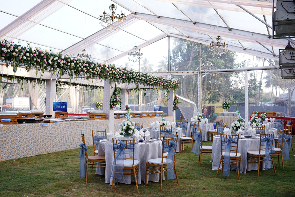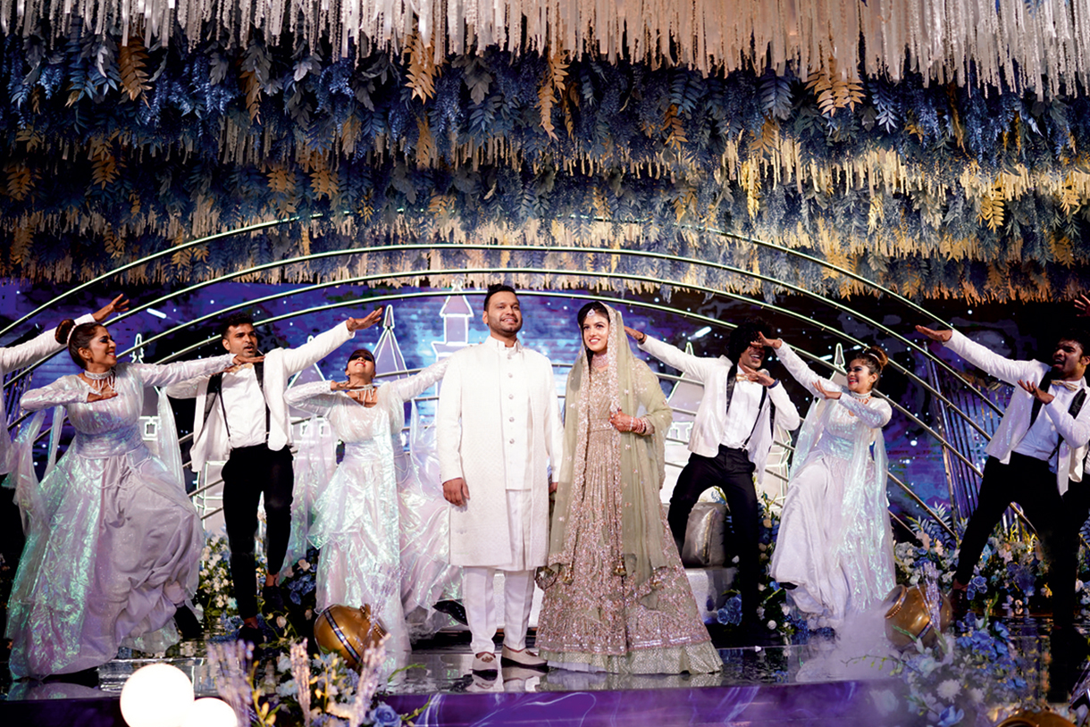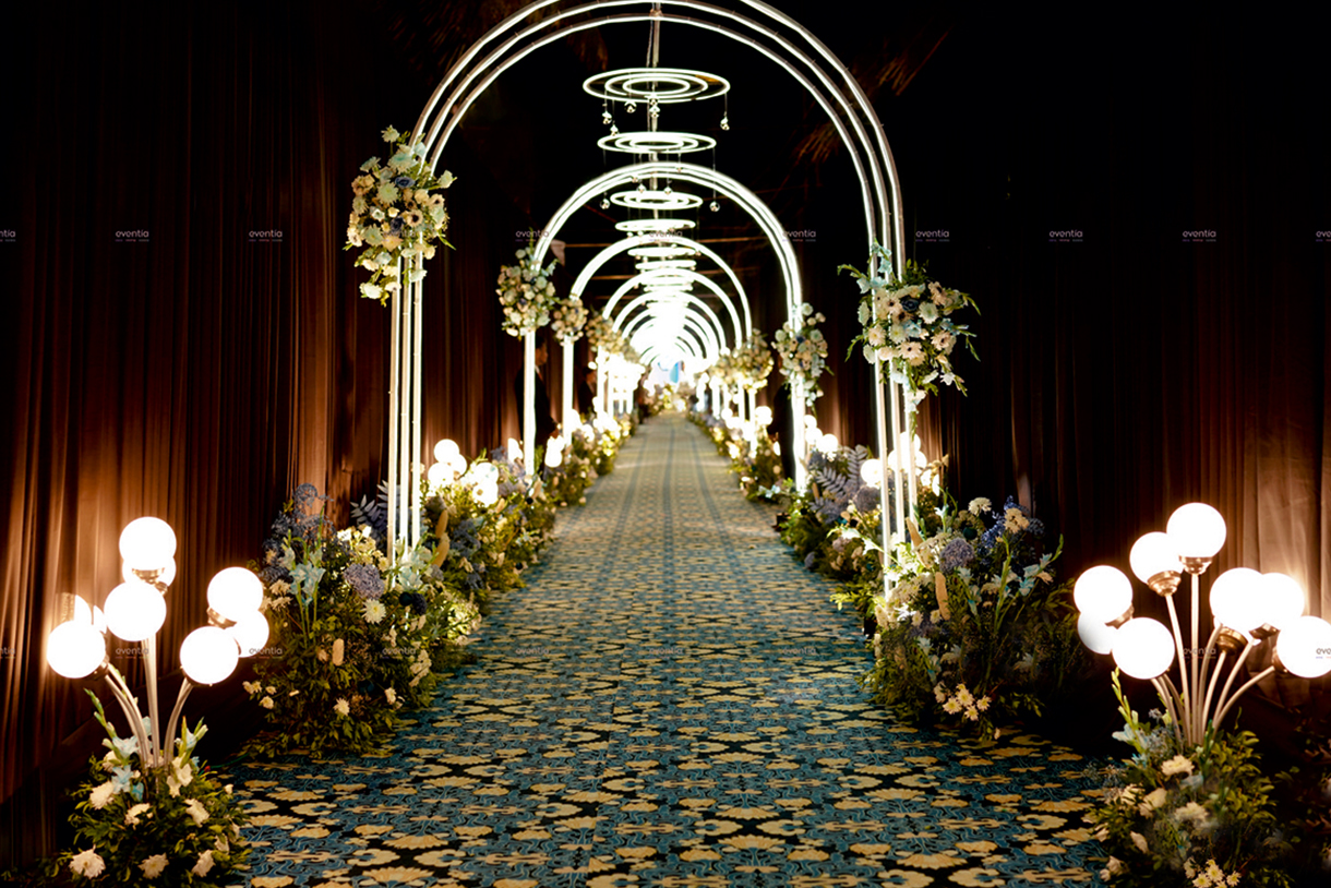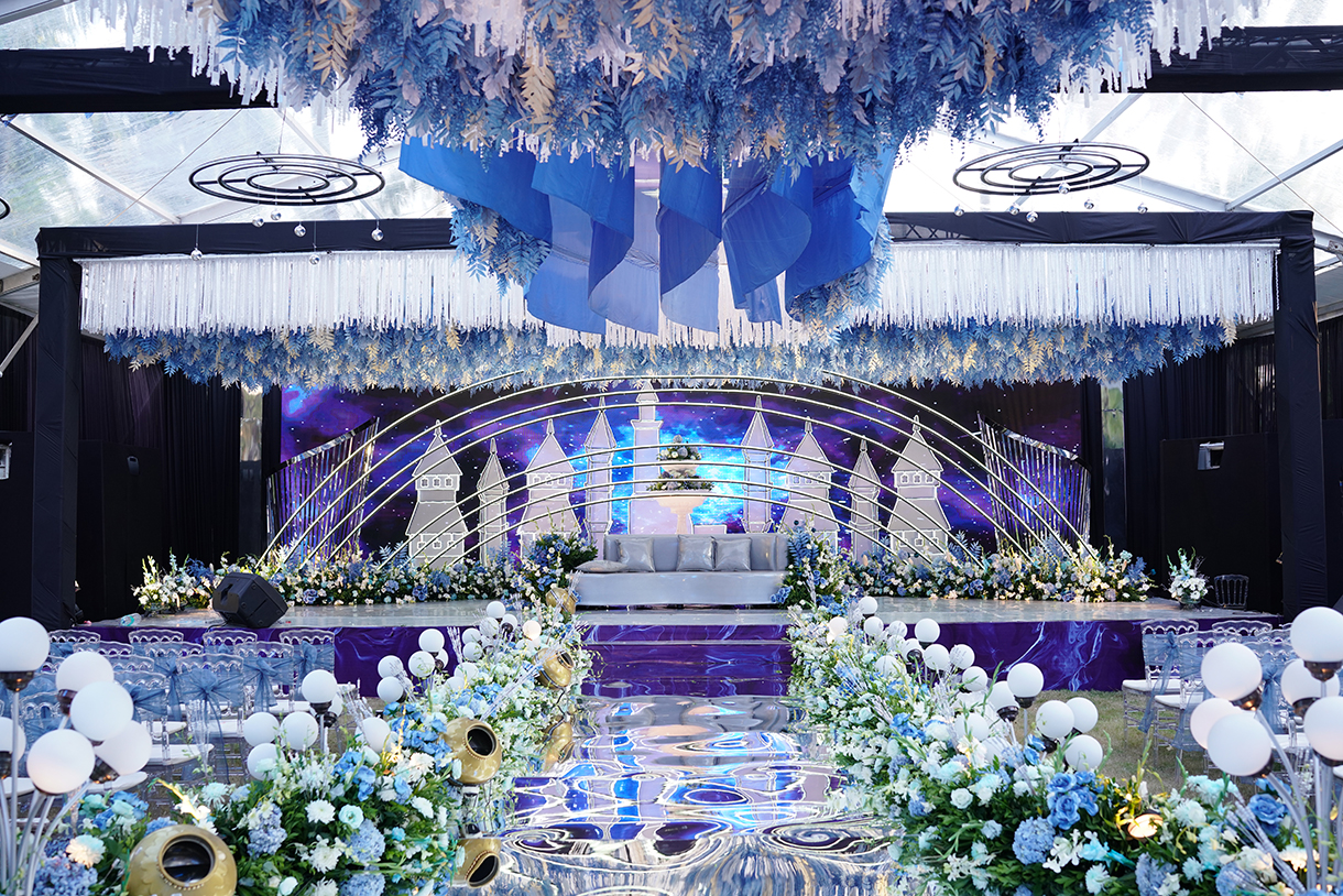 Stepping away from color schemes, themes, and entertainment frequently witnessed in luxurious Muslim weddings in Kerala, blue was chosen as the focal color, serene yet celebratory at the same time. Dubbed the “Blue Mist”, the evening was conceptualized as dreamy and tranquil where the misty December night would play its part. There is always a sense of magic associated with misty blue skies, and the planning team used this to bring a sense of anticipation and thrill to what was going to be a truly magical night.
