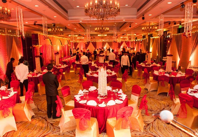 The Nikkah ceremony on the Prince of Wales Lawn was followed by a seated dinner in the Queen Victoria Ballroom, which was completely transformed from the original purple color to traditional red and gold. The entrance to the ballroom was lined with rose petals and traditional Urlis. Upon arrival, the guests received metal handicraft Bidri boxes filled with nuts and sweets, a reminder of their time in India and the memorable celebration which they were a part of.