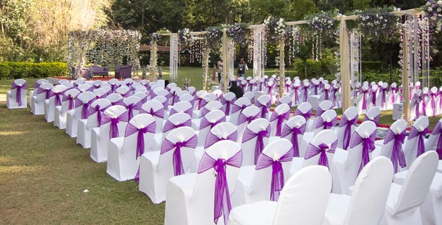 Next was the Wedding day. All our guests gathered at the Taj West End on a beautiful Sunday afternoon for the baraat, which came from the back entrance of the Taj to the Prince of Wales Lawn. The focal point of the ceremony was the mandap adorned with abundant fresh flowers, crystals and pearls. The aisle created for our entrance to the mandap was draped with champagne color fabric accentuated with abundant orchids, hydrangeas and crystals to match my ivory and purple lehenga. Background music with live sitar, tabla and flute complimented the ambiance.