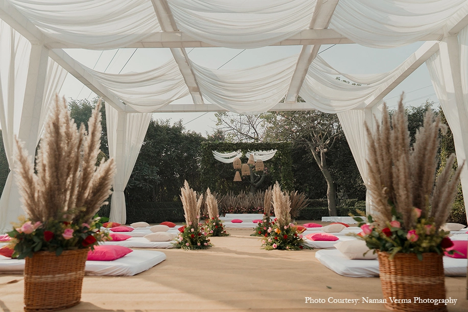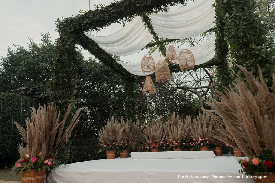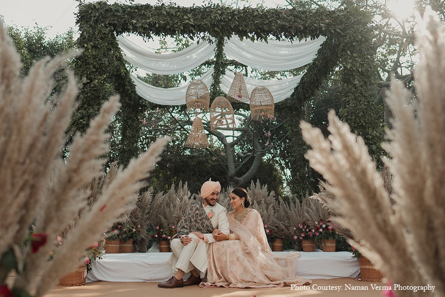 Whimsical wonderland anyone? Designers by profession, Kashish Chopra and Kunwar Chetan dreamt up a cozy, sustainable celebration for their Gurgaon wedding with just 35 guests, which was executed with great attention to detail by WeddingSutra Favorite – Mogra by Namita. Set up in a lush natural setting, the rustic, minimal decor seamlessly merged with the surroundings as it delicately elevated the earthy elements.