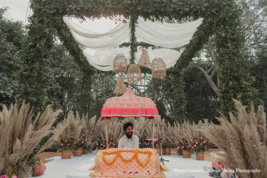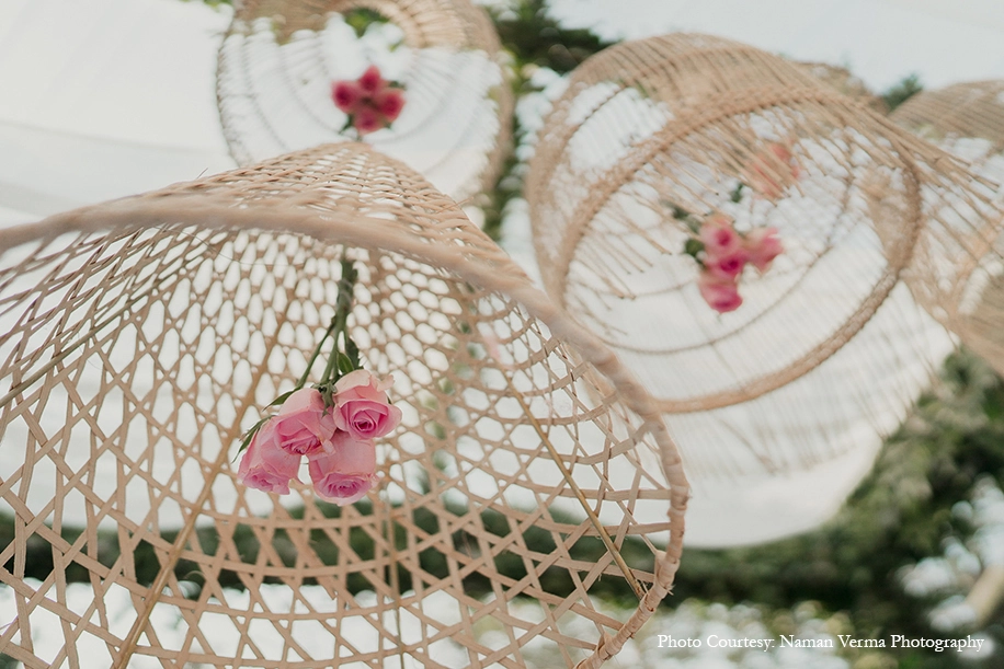 The mandap for the Anand Karaj crafted out of thick green foliage and flowing white drapes set a serene tone for the occasion, beautifully blending into the verdant backdrop. Floor seating with plush cushions added a cozy touch to the day. Cane baskets of flowers and pampas grass added a charming bohemian touch, which were then all gifted to the guests. Additional earthen pots full of flowers around the venue were later reused by the bride’s mother at her home. Delicate details requested by the groom such as flowers in the cane chandeliers added a special touch to complete the decor.