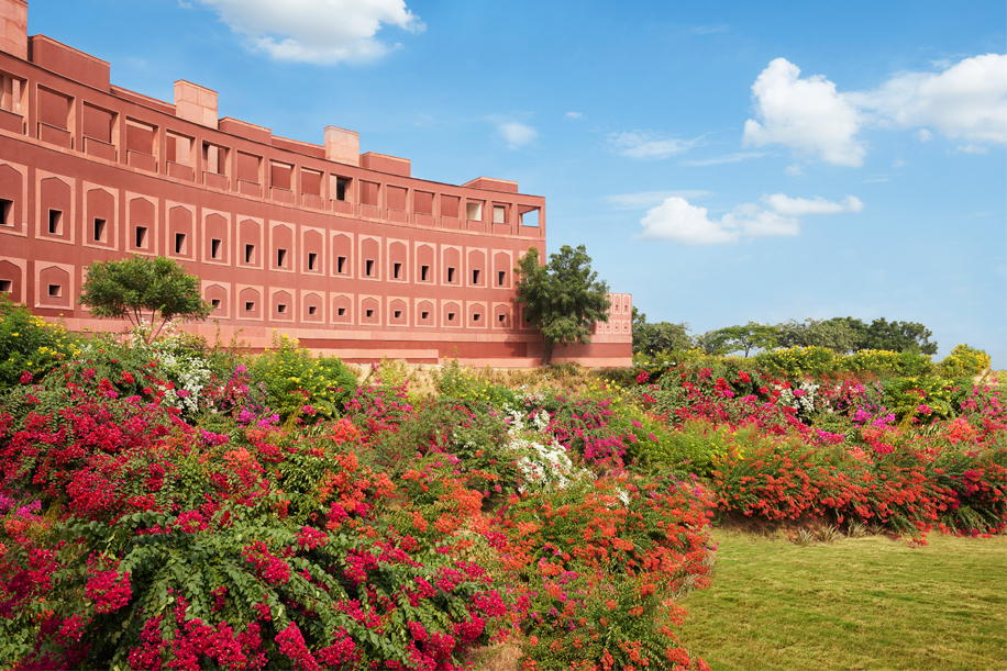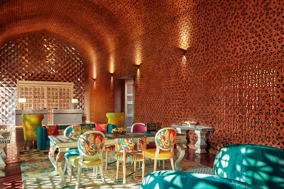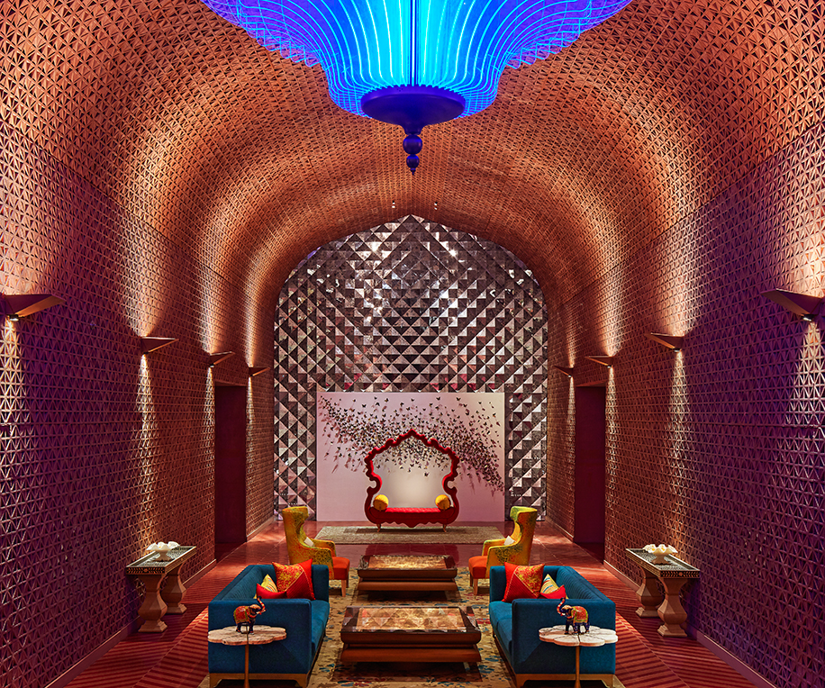 The coral pink reception with its domed ceiling offers a grand yet welcoming ambiance to guests. Rajasthani design and decor influences like red stone art, Mewari thekri (broken mirror) work, blue pottery, paisely motifs and leheriya prints are incorporated into the design, featuring lattice work, curved walls, and skylights, in contemporary ways.